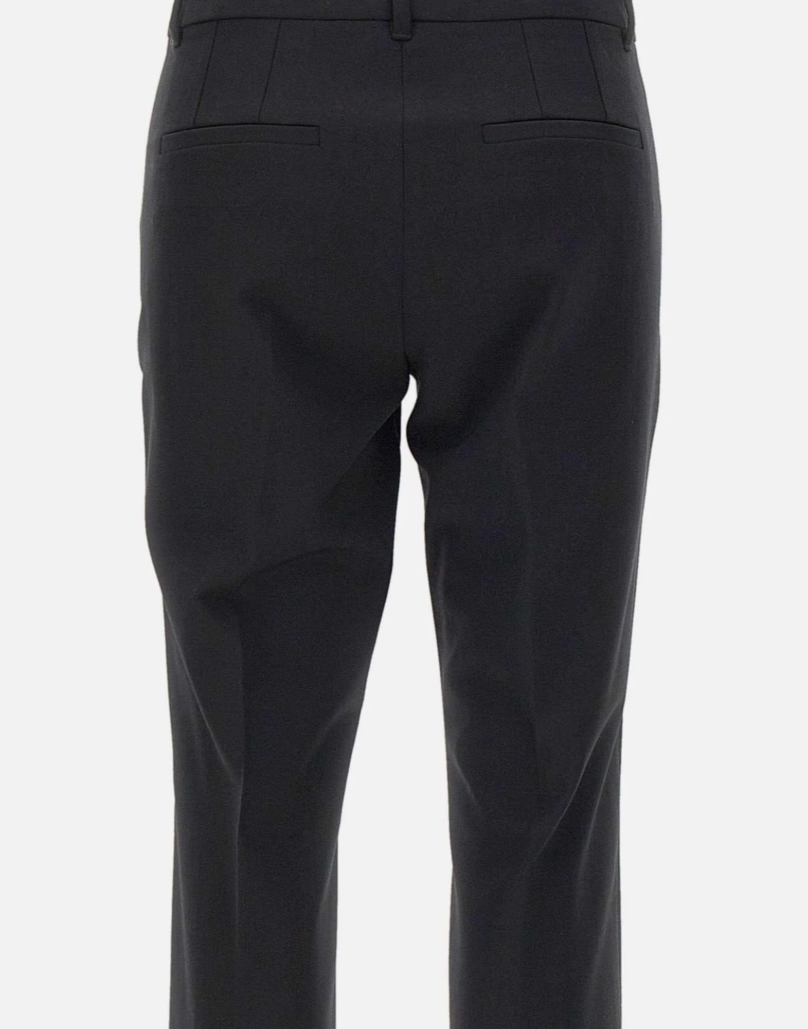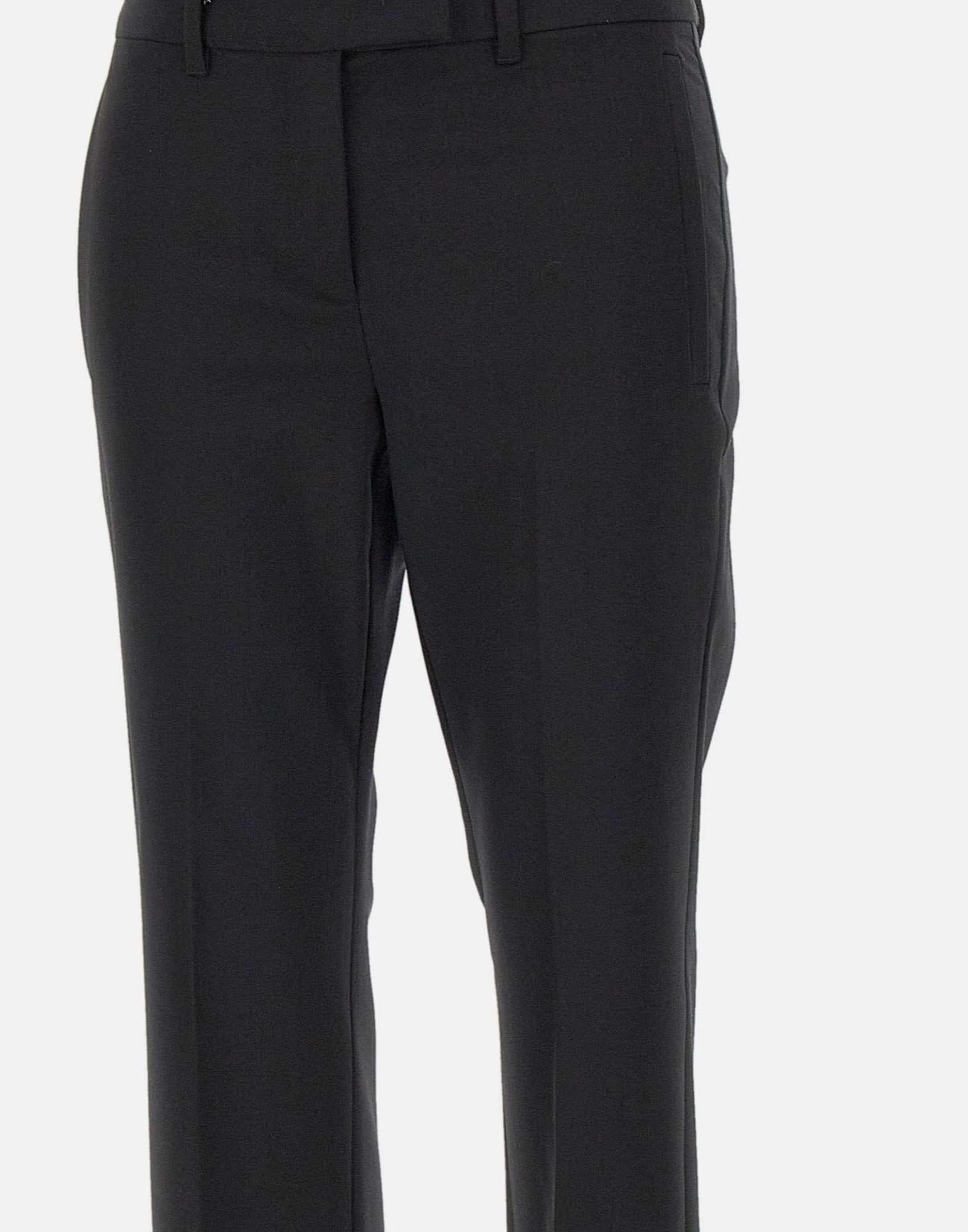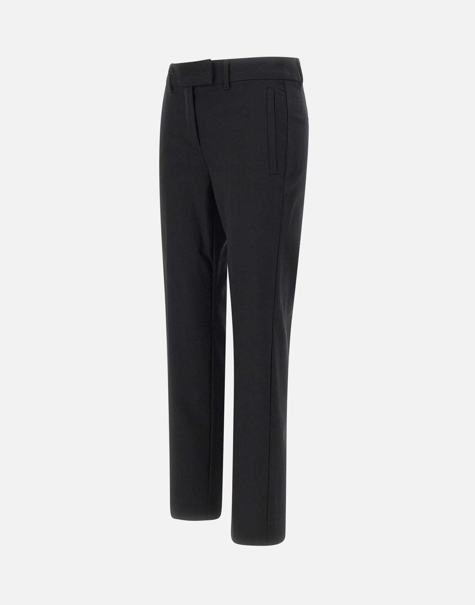 Pantaloni Marella “Opaco”, nero, in tessuto di misto lana stretch con effetto diagonale, chiusura con gancio e zip nascosti, cintura con passanti, piega stirata fronte e retro, tasche laterali alla francese e posteriori a filetto, fondo 17cm, slim fit