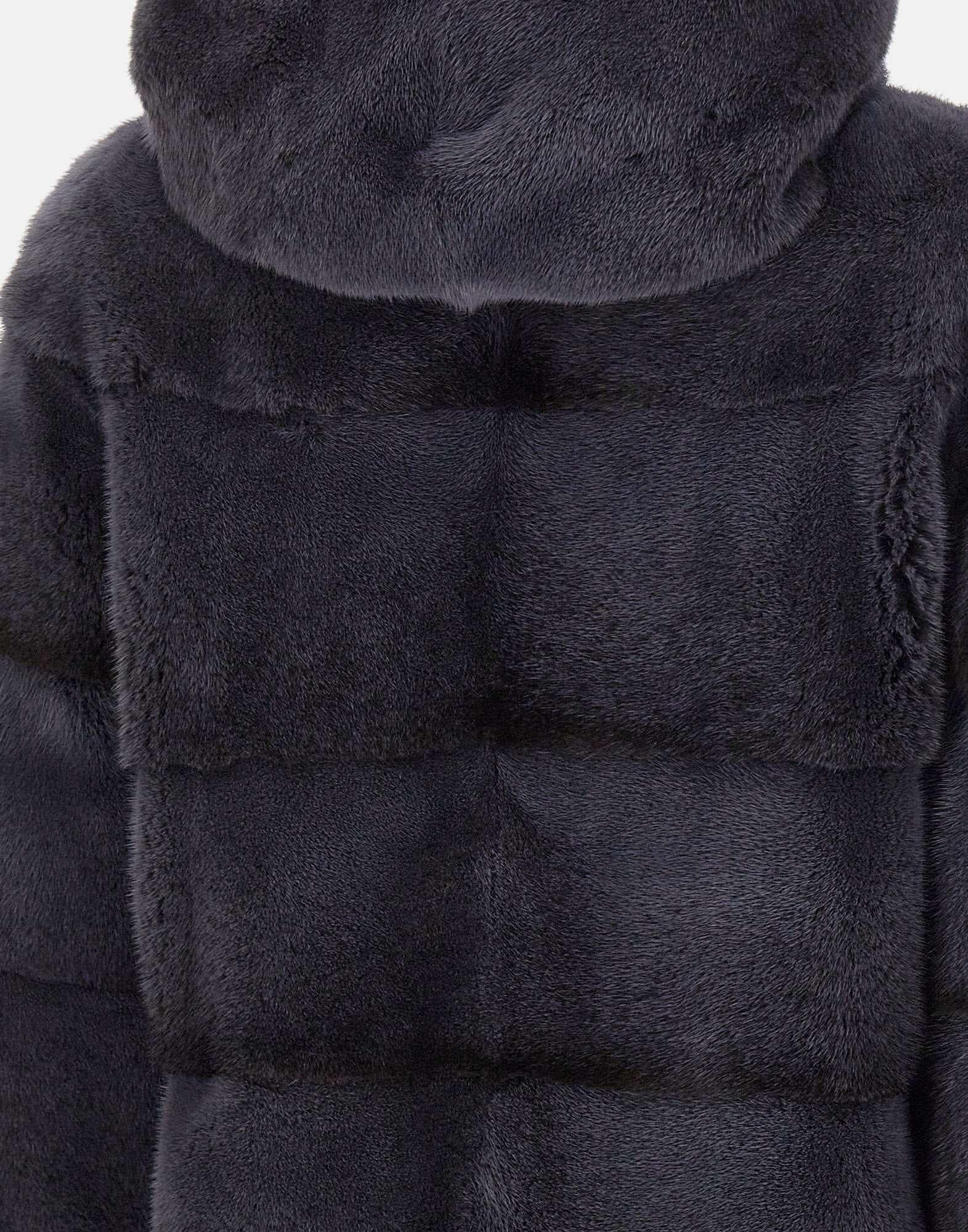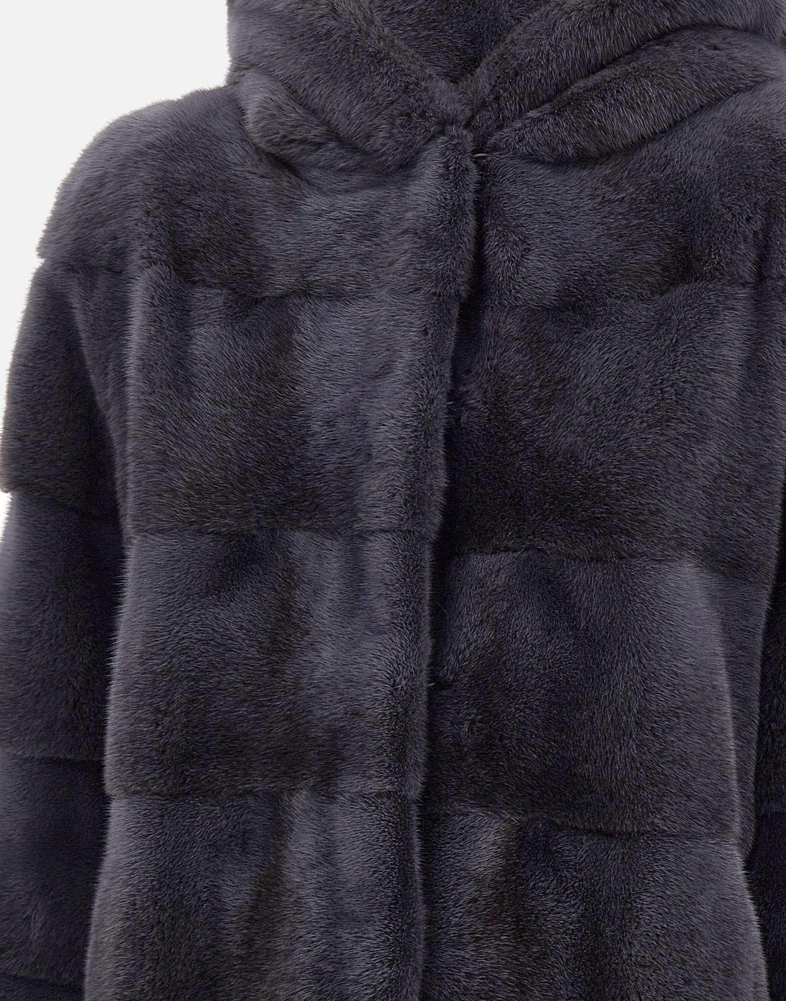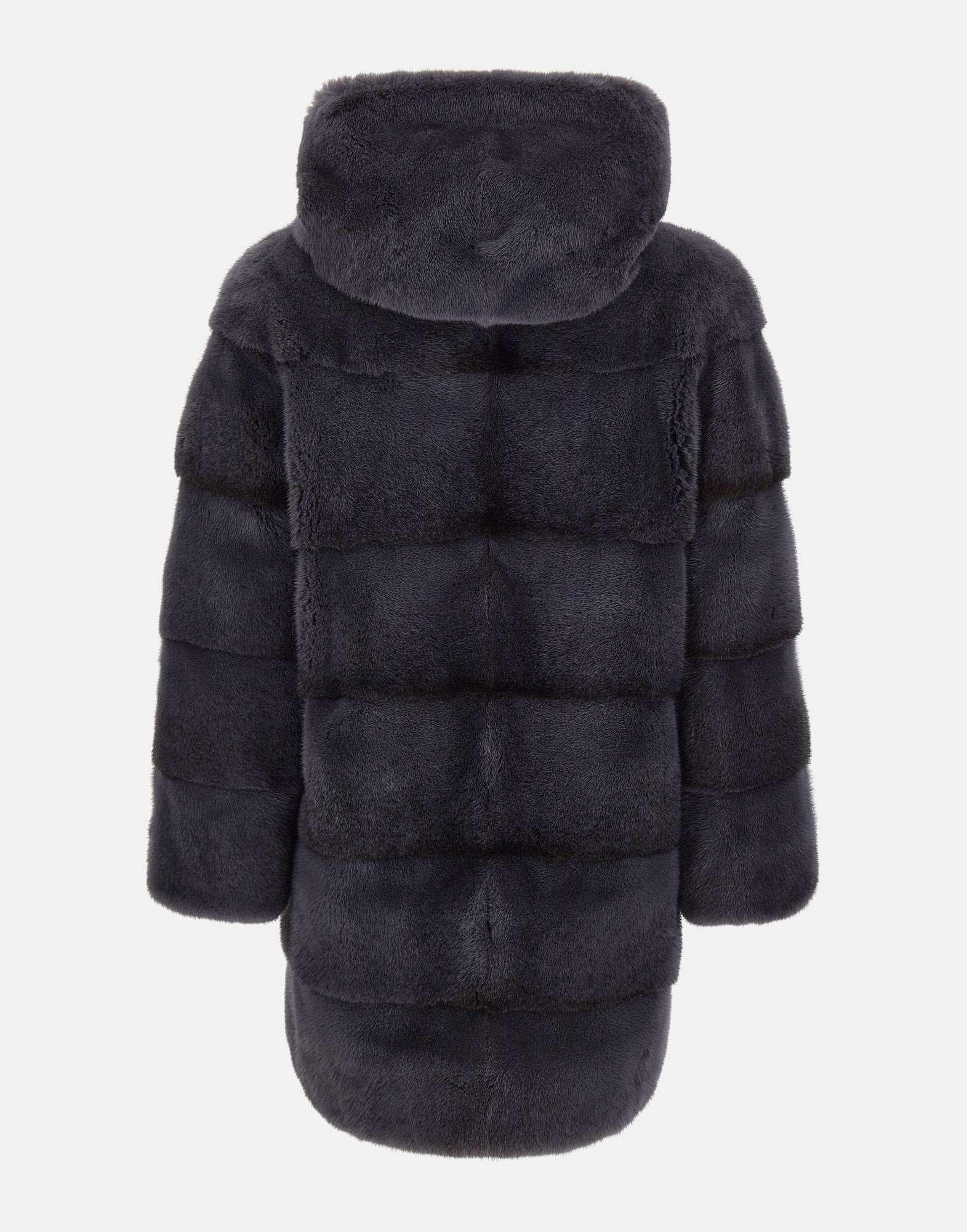 Pelliccia da donna Frame in visone grigio scuro, caratterizzata da una lavorazione a coste orizzontali che ne esalta leleganza e la texture morbida. Il design dalla lunghezza media avvolge con raffinatezza, mentre le due tasche laterali a fessura aggiungono praticità senza compromettere lo stile.