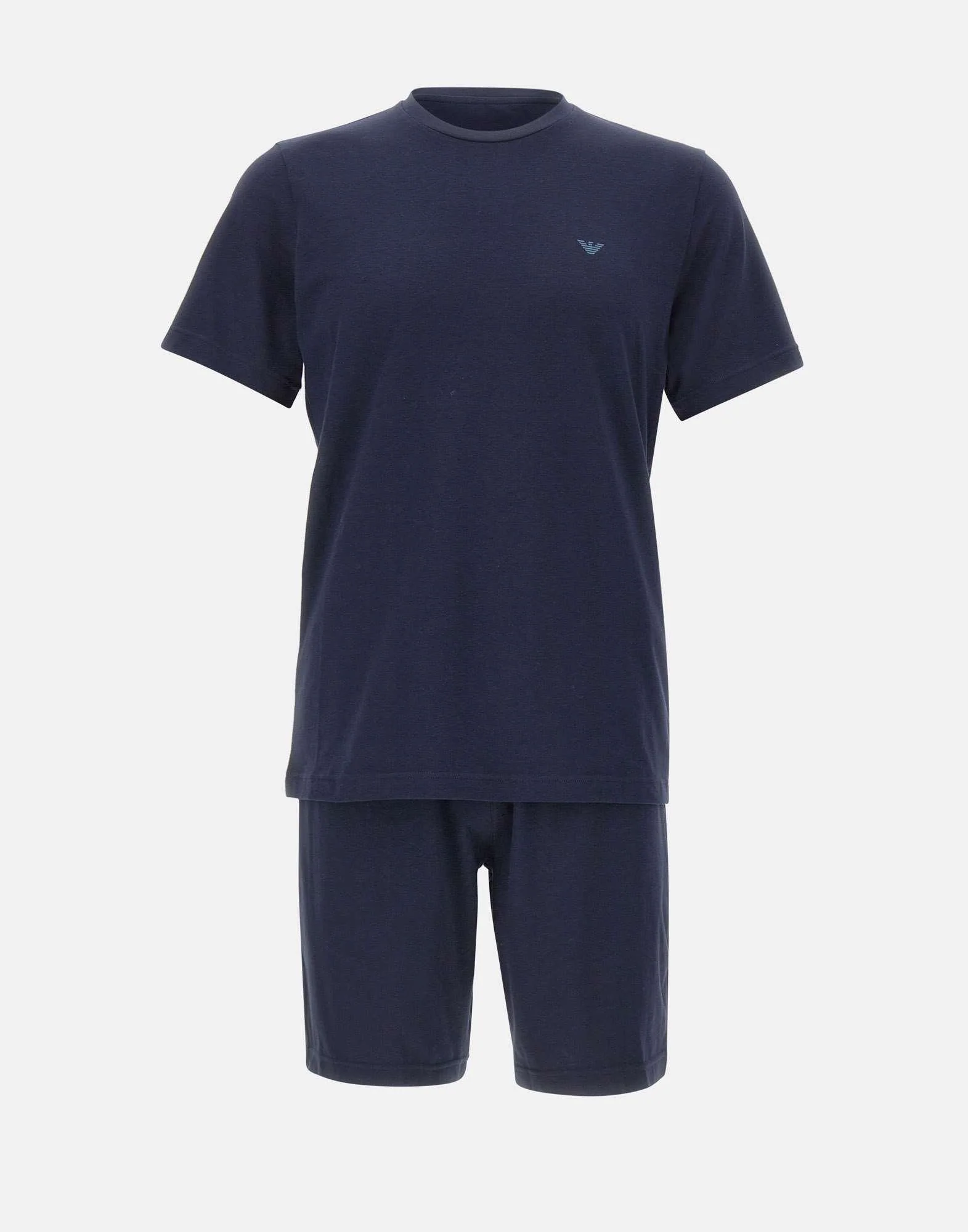 Pigiama uomo Emporio Armani realizzato in jersey Endurance color blu scuro, pensato per un comfort quotidiano e uno stile essenziale. Il set è composto da bermuda con fascia elastica logata in vita e tasche laterali, abbinati a una t-shirt girocollo a maniche corte con logo aquila sul petto, dettaglio iconico del brand. Un pigiama uomo in jersey morbido e pratico, ideale per relax e tempo libero. Regular fit.