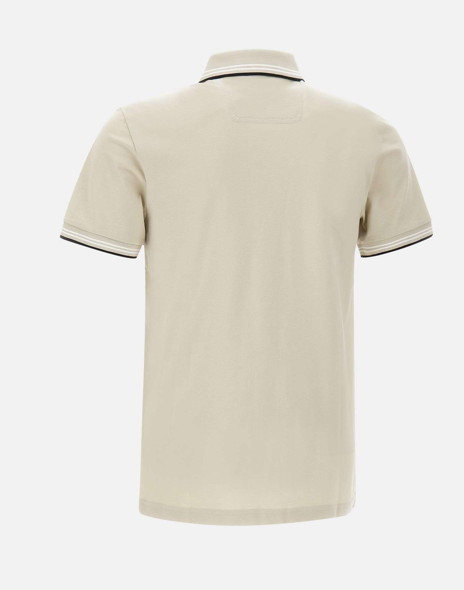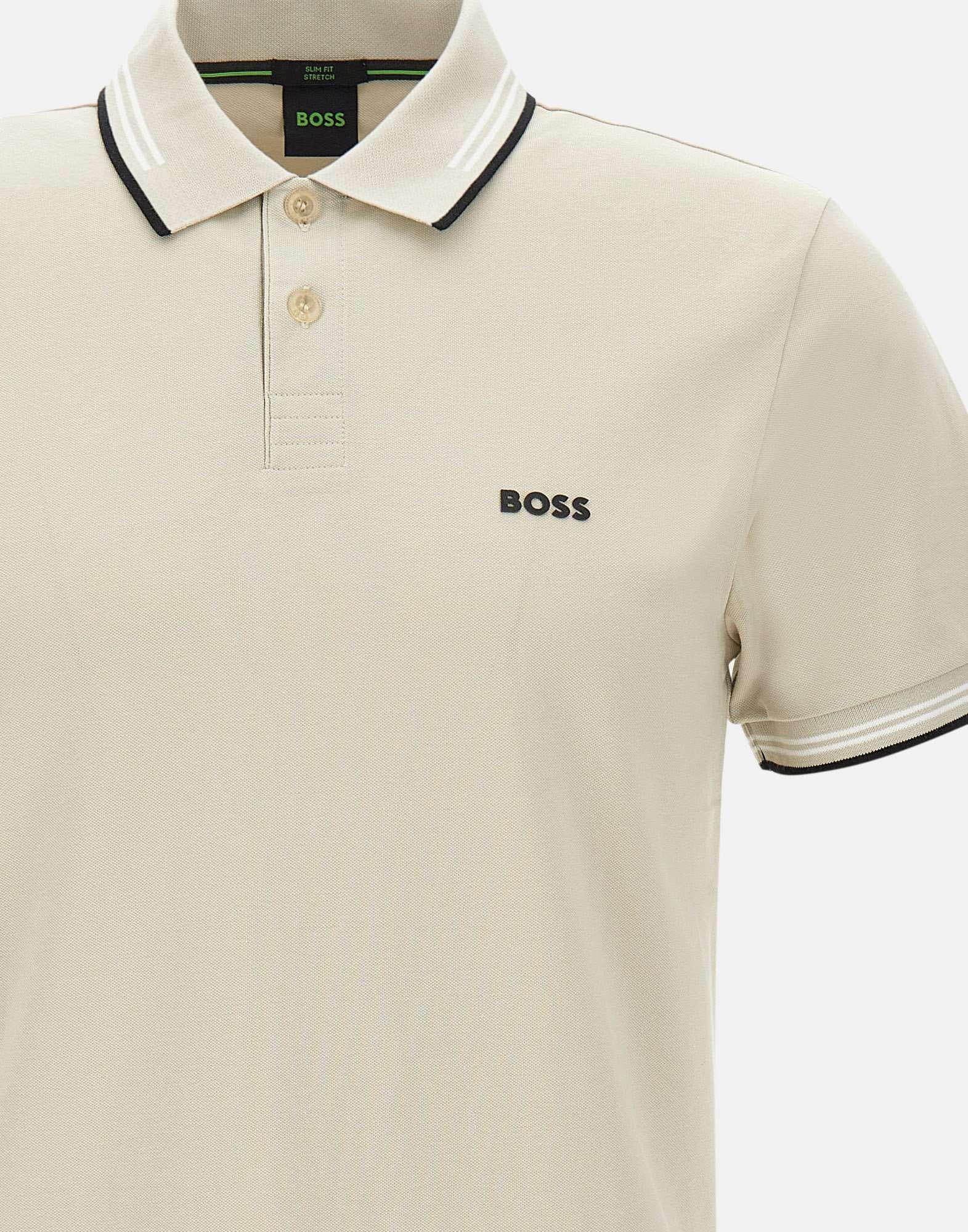 Polo uomo Boss “Paul” realizzata in cotone elasticizzato color beige, caratterizzata da un design pulito con dettagli a contrasto. Il modello presenta colletto a maglia piatta con due bottoni e maniche corte con bordo a costine, completati da righe bianche e nere a contrasto su colletto e orlo maniche che definiscono un profilo grafico e contemporaneo. Sul petto è presente logo a contrasto nero in gomma, discreto ma riconoscibile. La vestibilità slim fit valorizza la linea con un fit asciutto e moderno. Una polo ideale per look casual curati e business casual estivi.