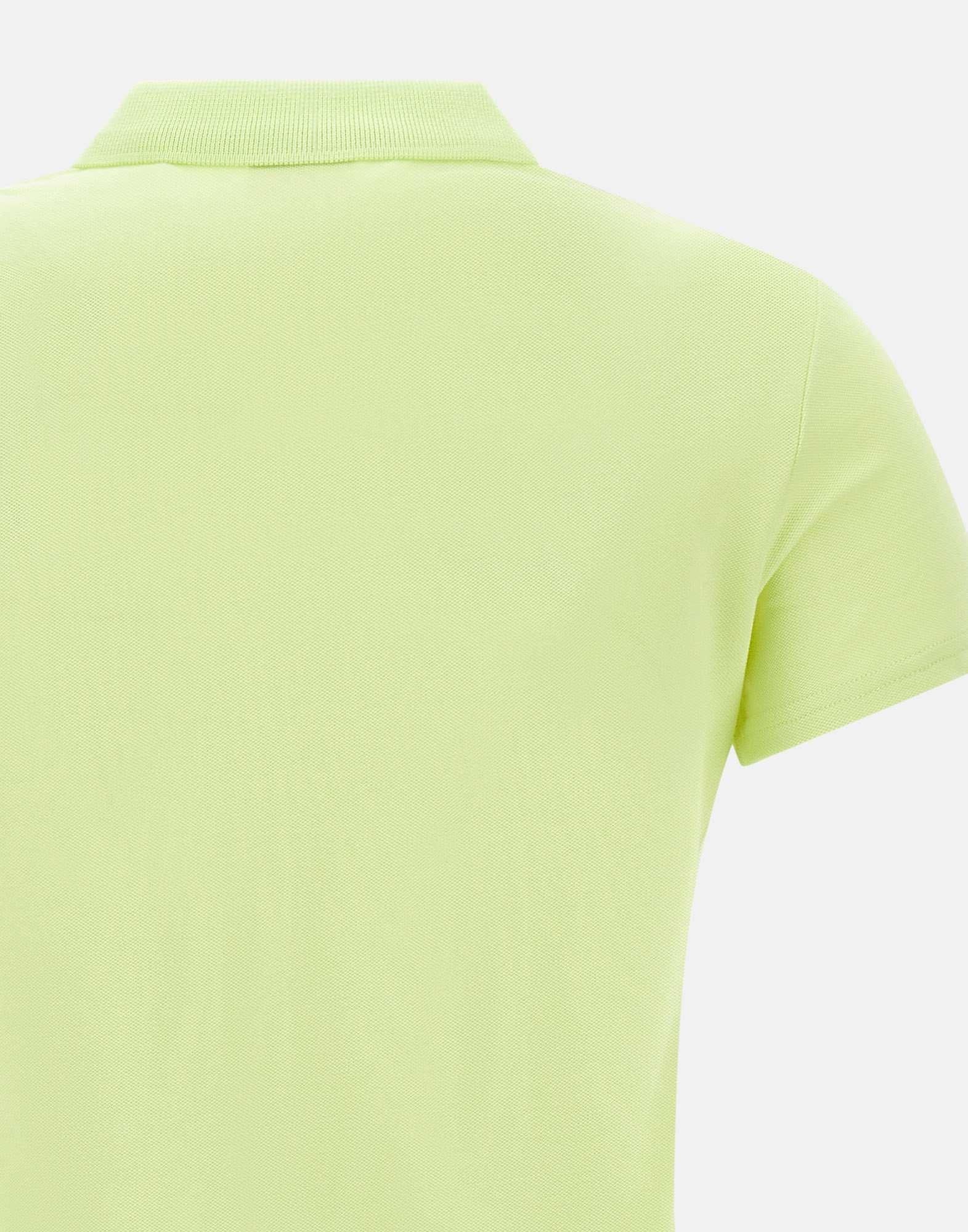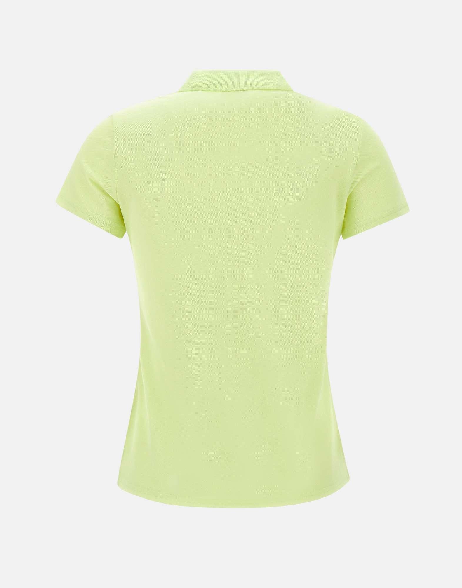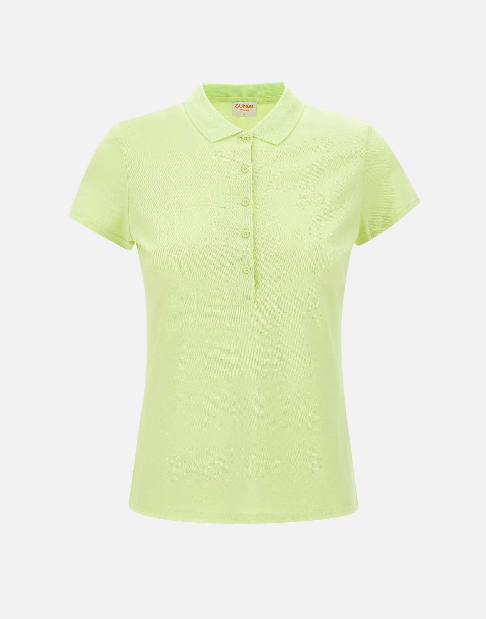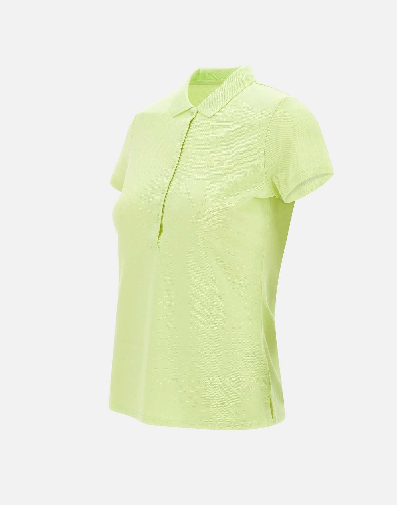 Polo “Solid” Sun68 donna, giallo limone, in cotone piquet stretch, colletto a coste,maniche corte, chiusura con cinque bottoni logati in tinta, logo sul petto con strass, slim fit