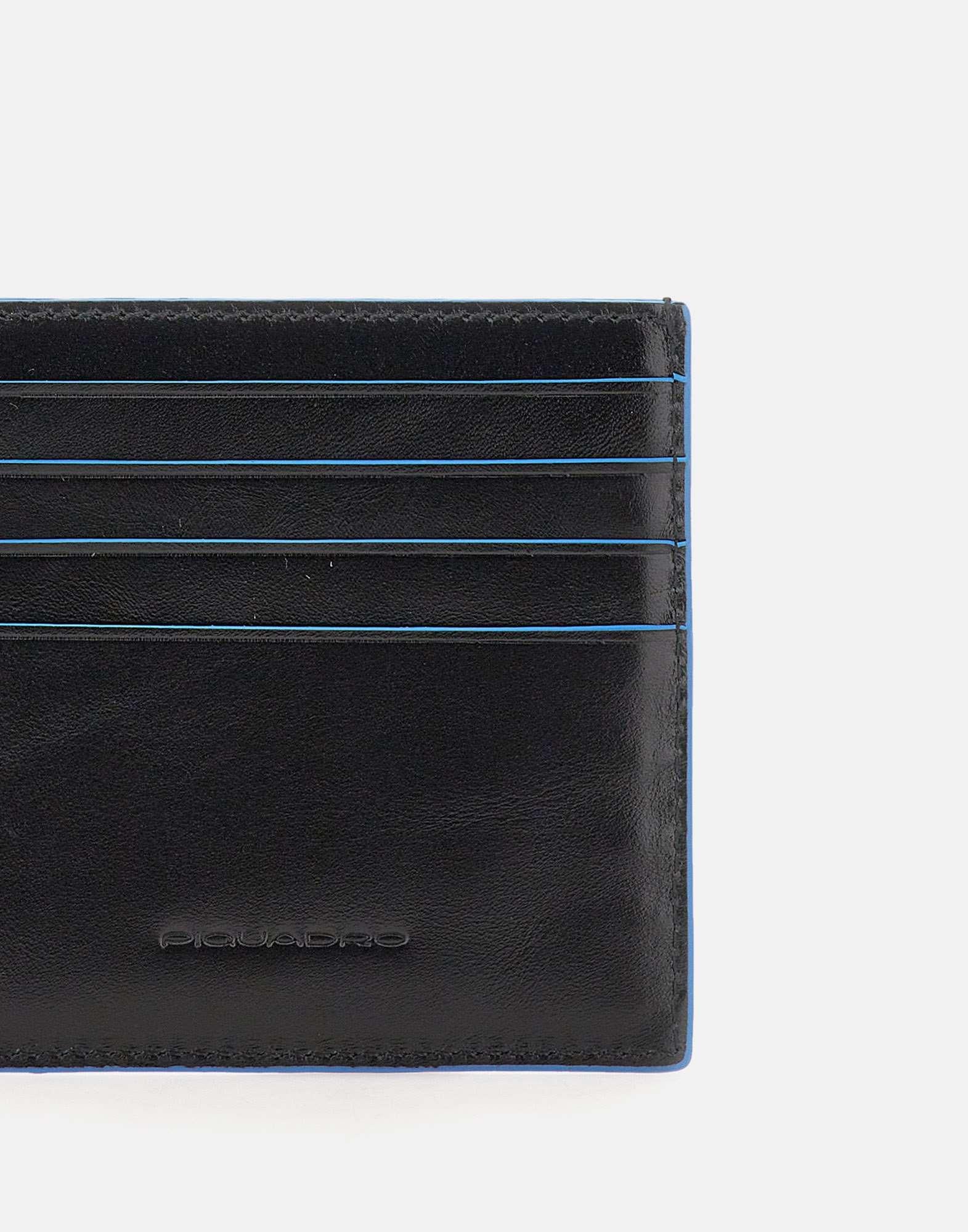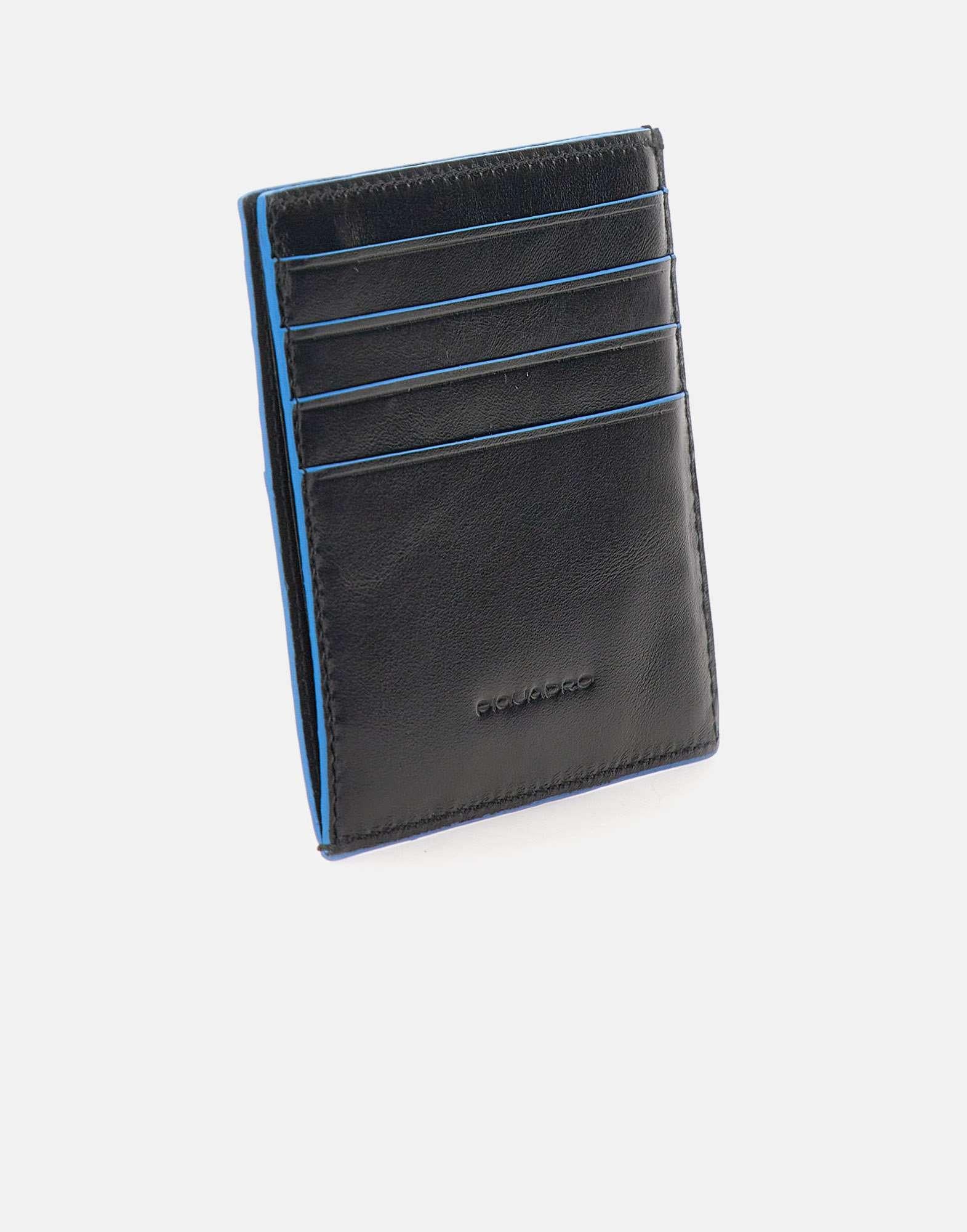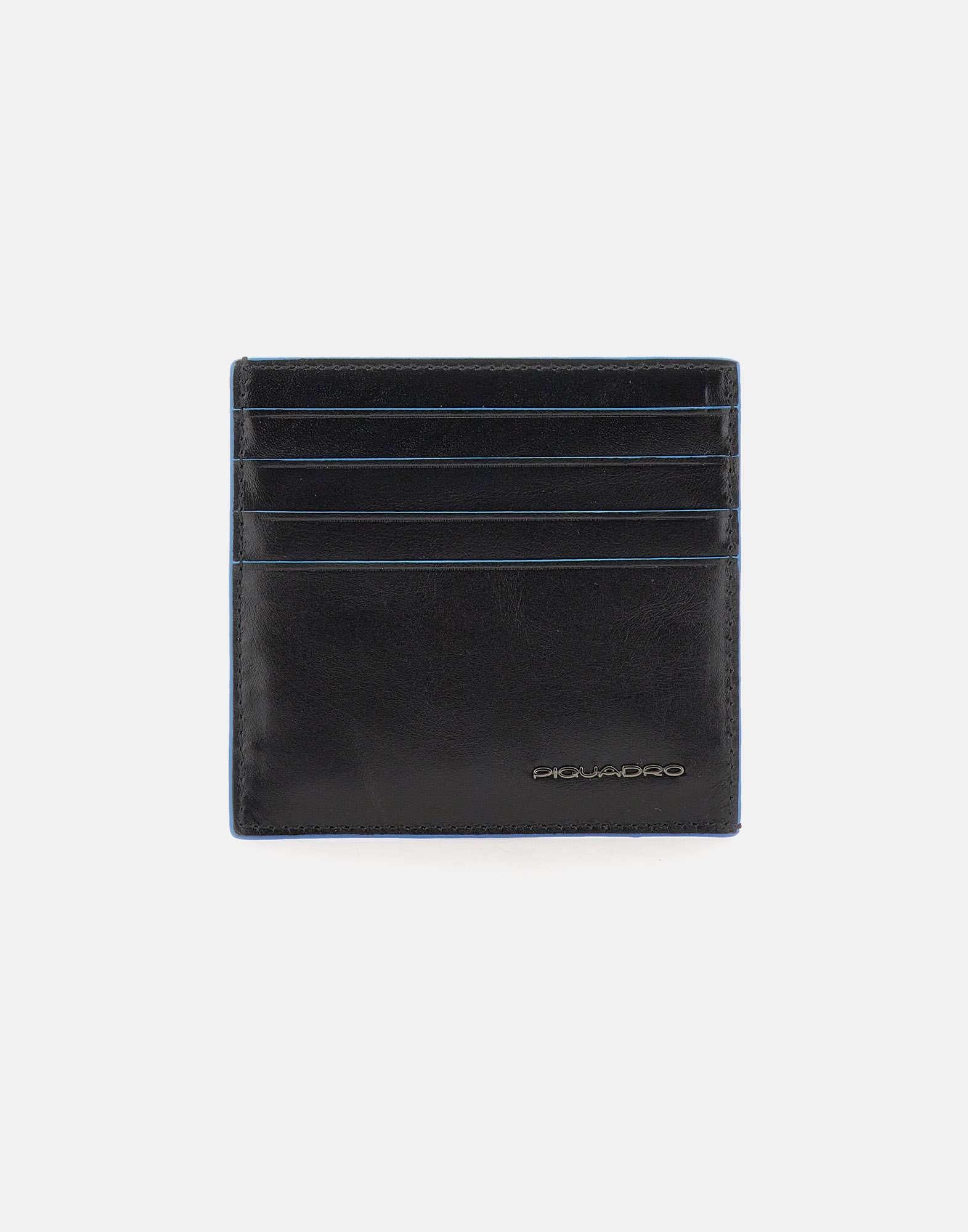 Portacarte Piquadro in pelle, nero, otto scomparti per carte, logo in metallo, protezione Rfid,altezza 10cm, lunghezza 10cm.