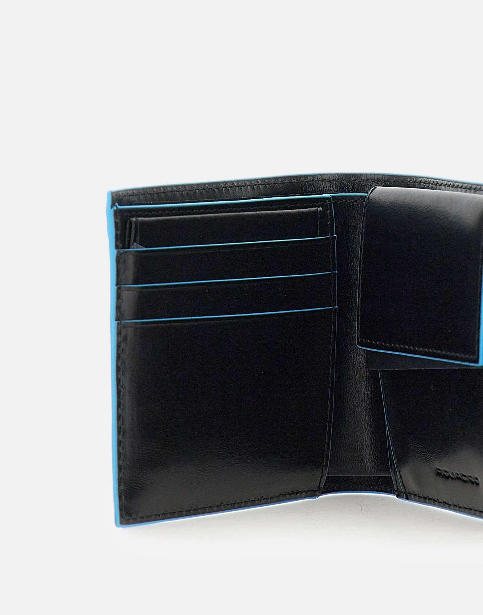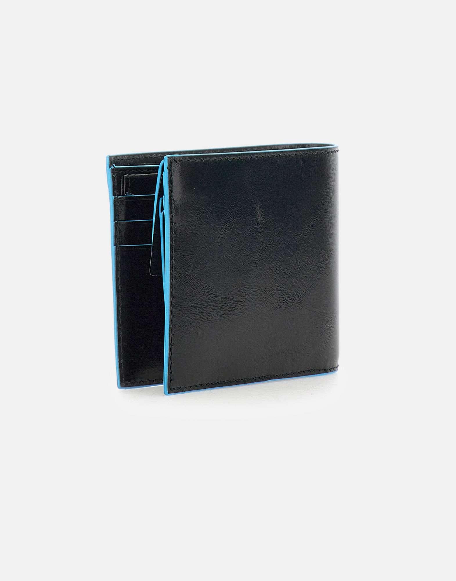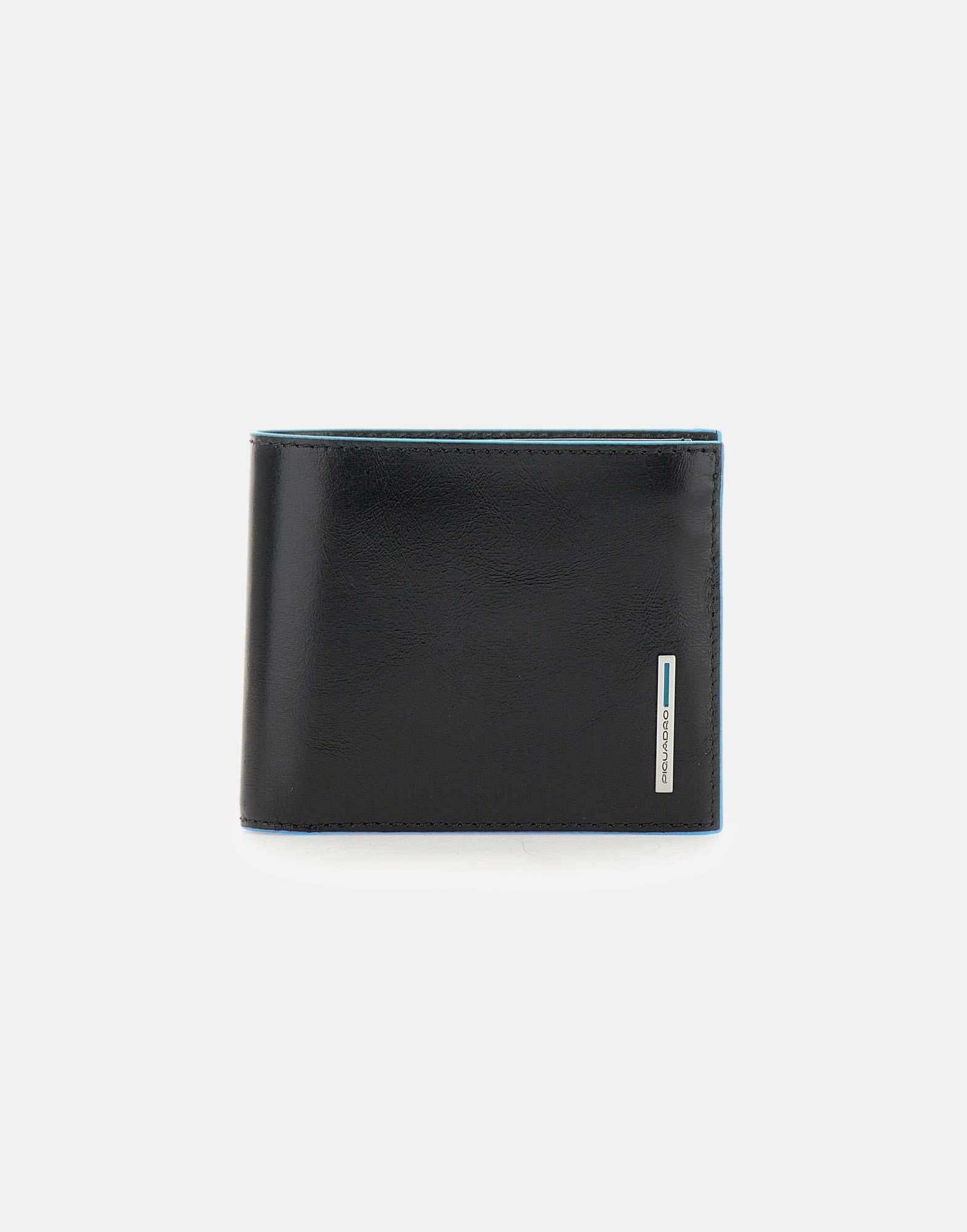 Portafoglio uomo Piquadro “Blue Square Special” in pelle, nero con profili blu, tasca portamonete con bottone,scomparti per carte di credito, ampi scomparti per banconote, logo impresso interno, logo in metallo sul fronte, larghezza 11 cm, altezza 9cm, profondità 2cm. Sistema Rfid Protected