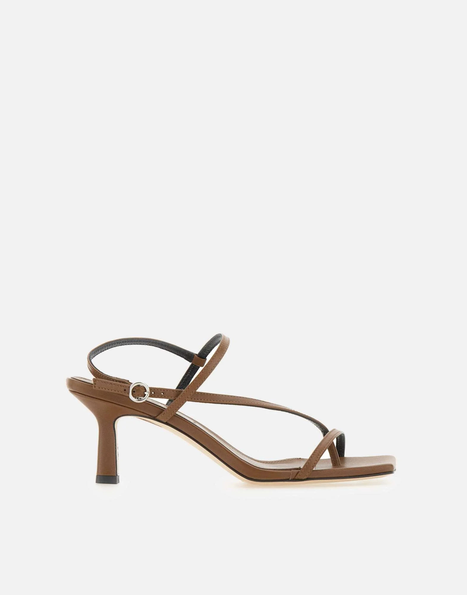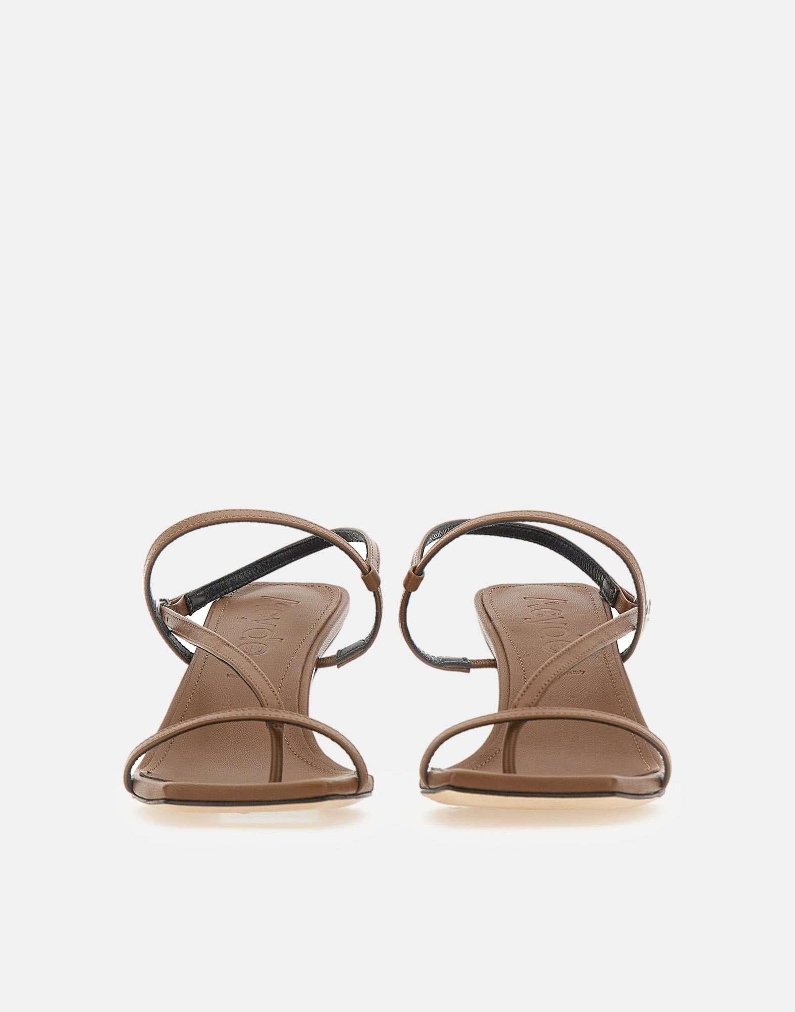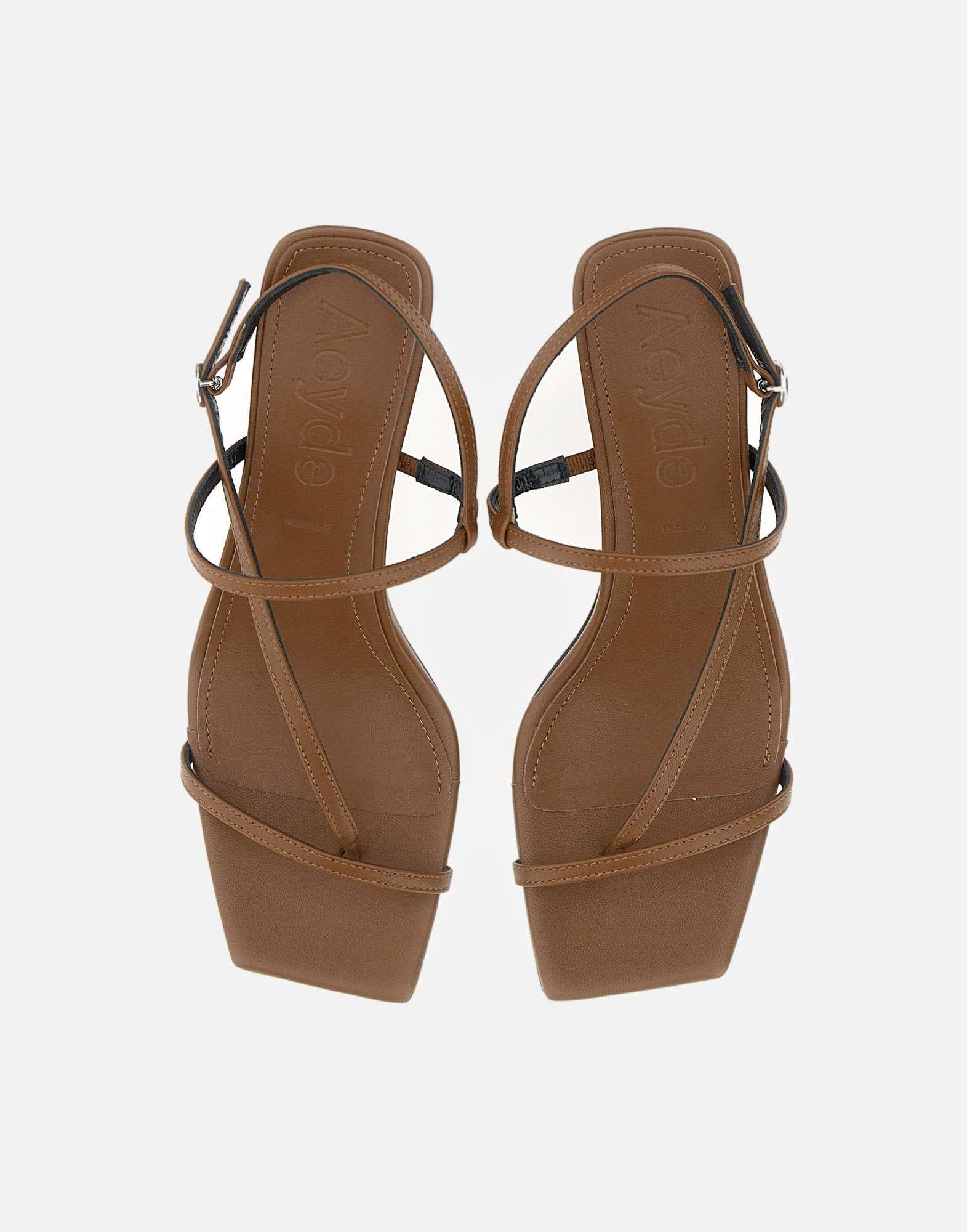 Sandali donna Aeyde “Elise” realizzati in morbida pelle nappa color tabacco, un classico del brand dal design minimal e contemporaneo. Questo sandalo presenta due listini sottili, uno sulle dita e uno che attraversa in diagonale il dorso del piede con terminazione ad infradito, per una linea essenziale e pulita. La chiusura con cinturino alla caviglia regolabile con fibbia assicura una calzata stabile e personalizzata. Made in Italy, pensato per completare look estivi raffinati e versatili in stile luxury fashion. Tacco a rocchetto alto 6,5 cm. Include dust bag.
