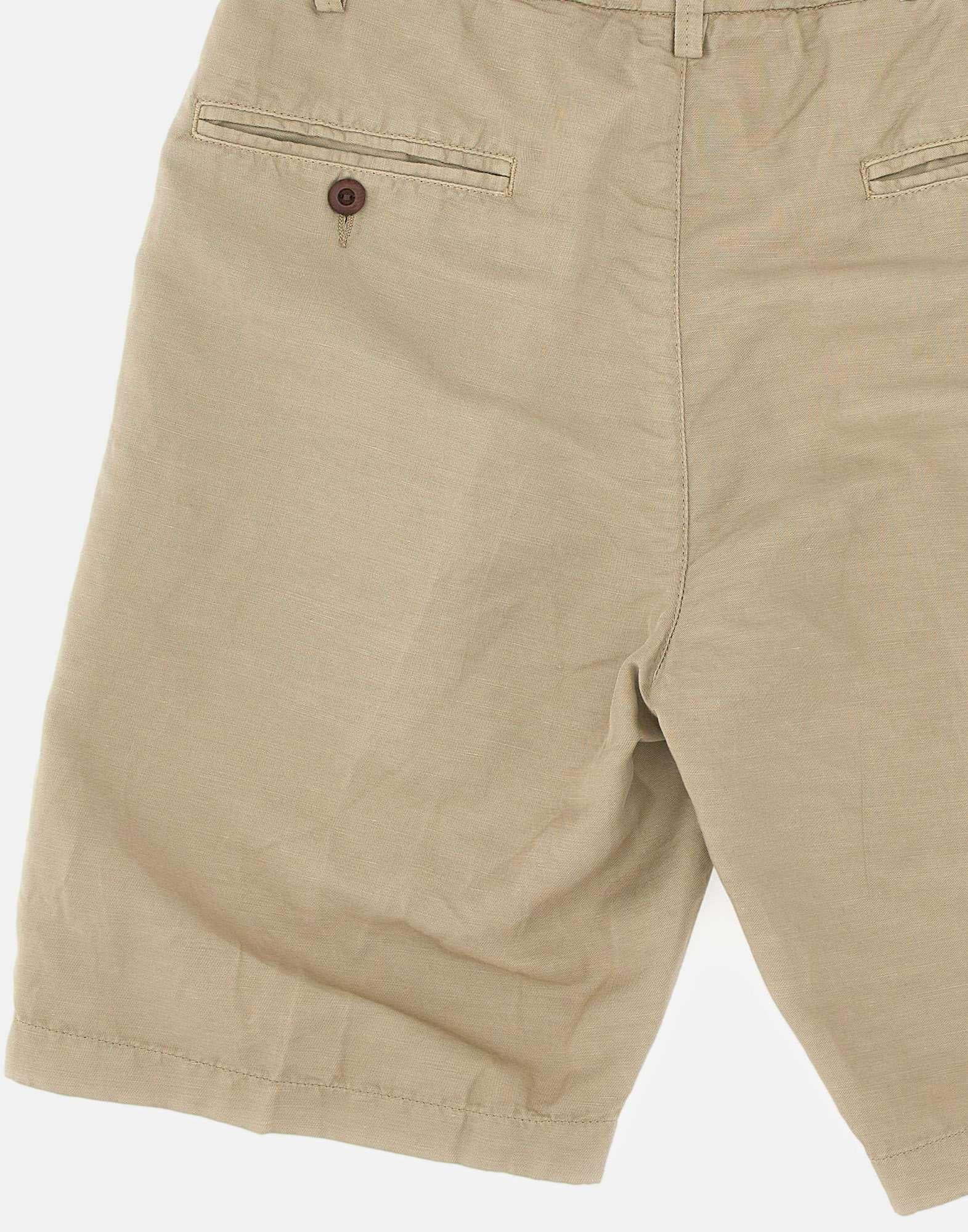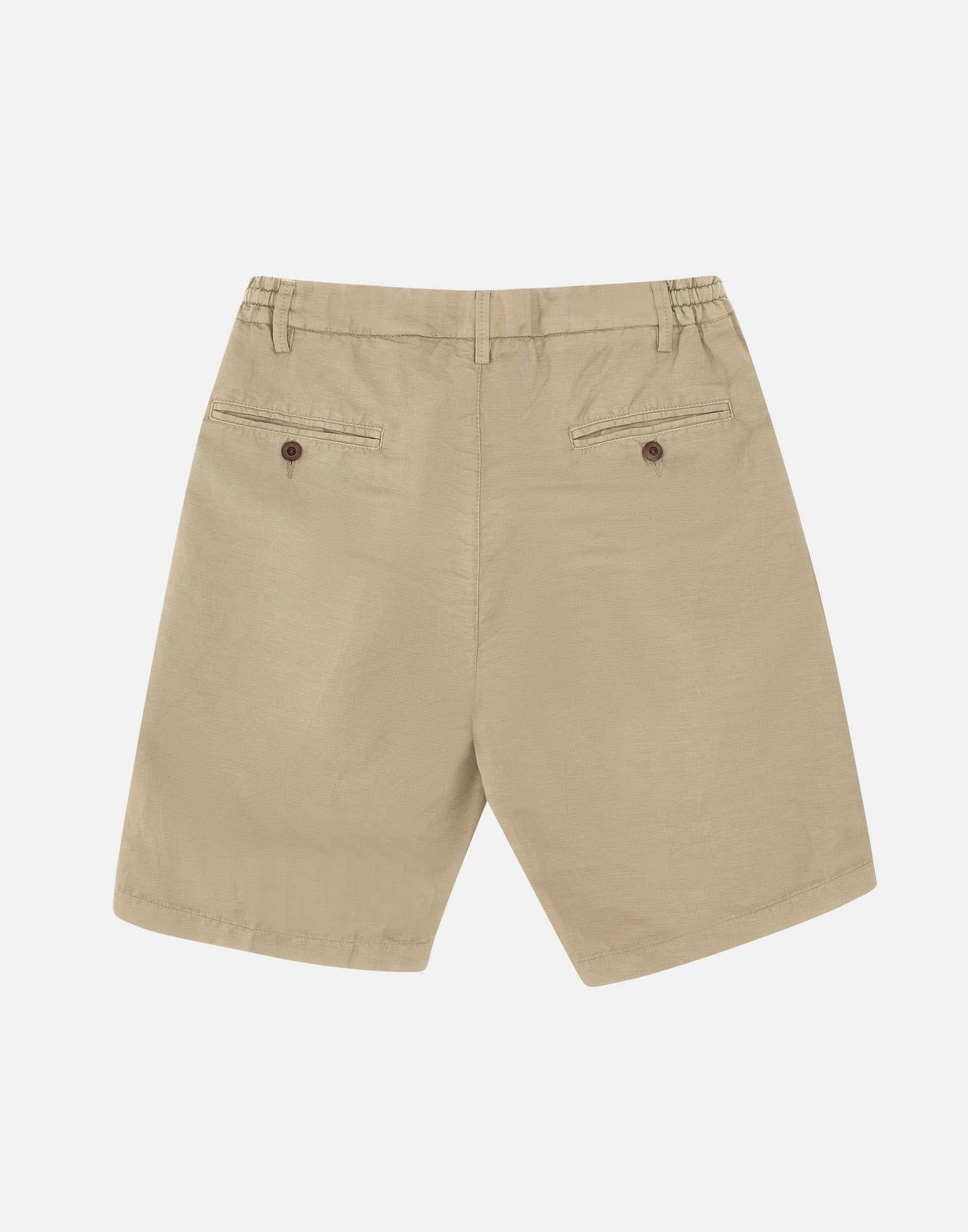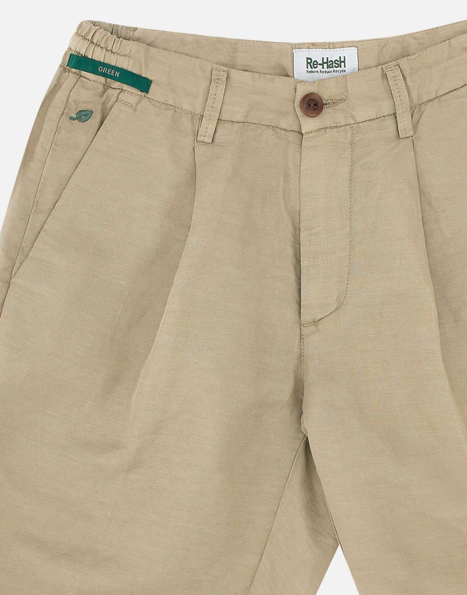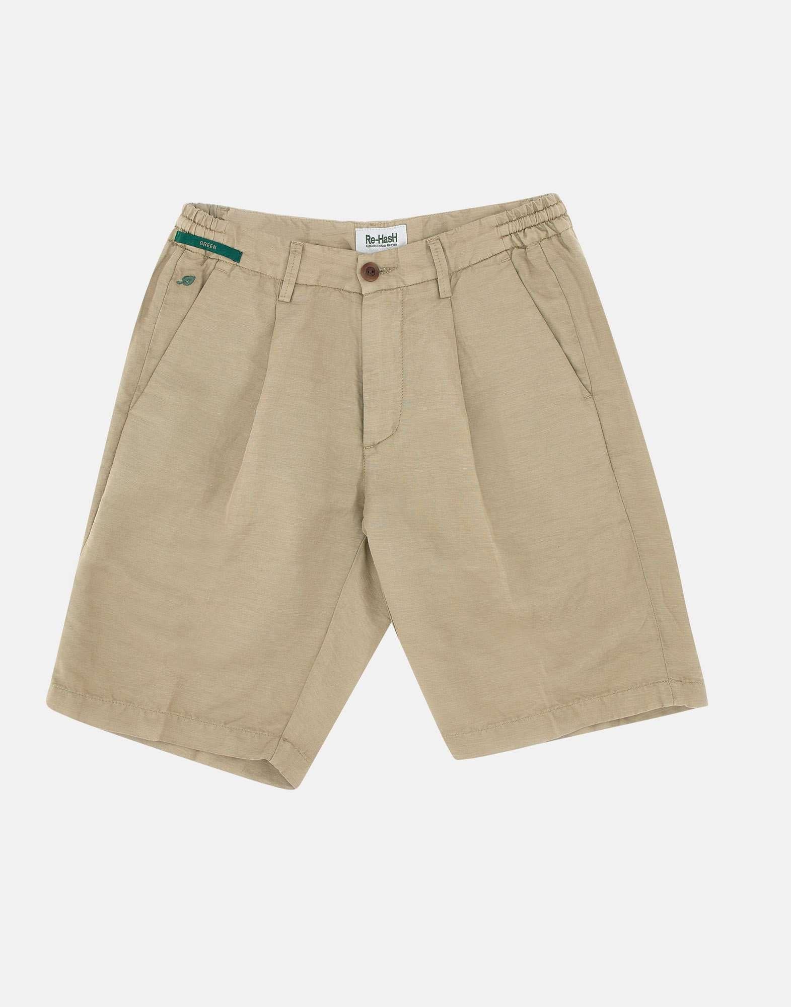 Shorts Re-Hash “Benson”, sabbia, Green collection, tessuto in canapa e cotone super fresco e comodo, taglio corto, vita parzialmente elasticata con passanti per cintura, chiusura con zip e bottone, pince singola, tasche laterali a filo, tasche posteriori con bottone, regular fit, made in Italy