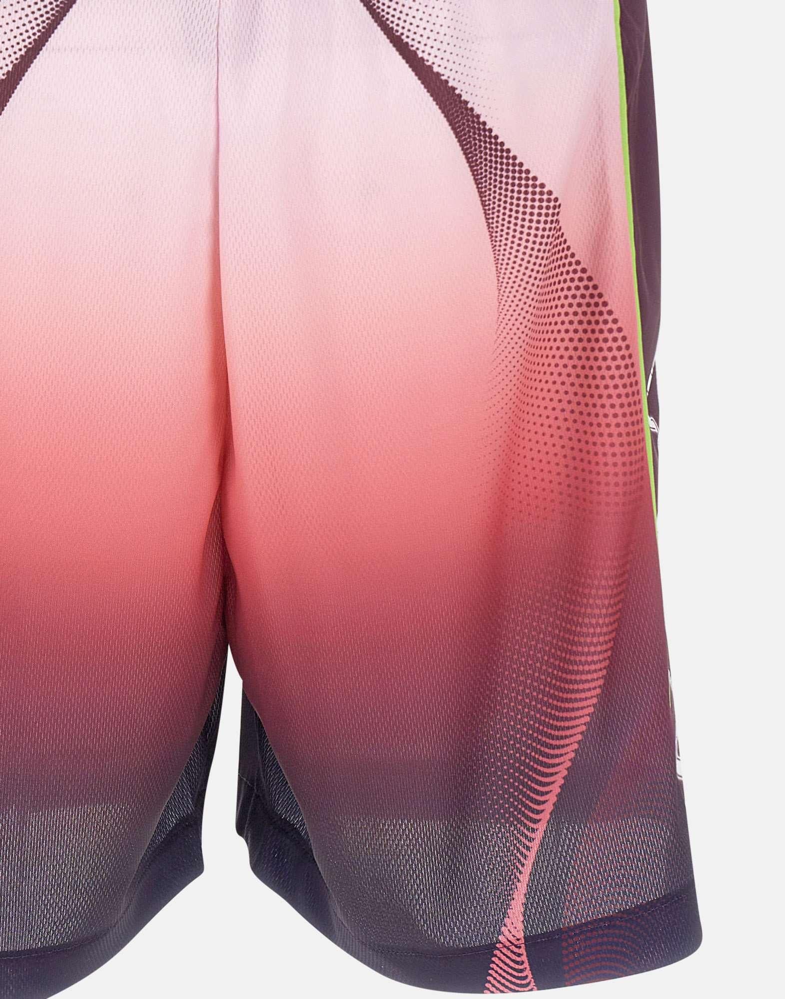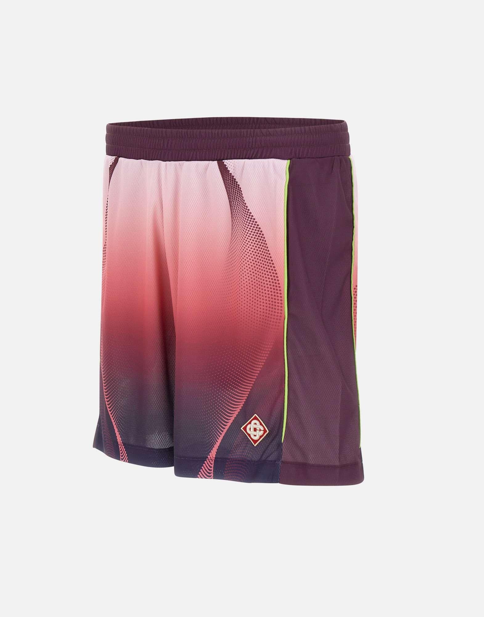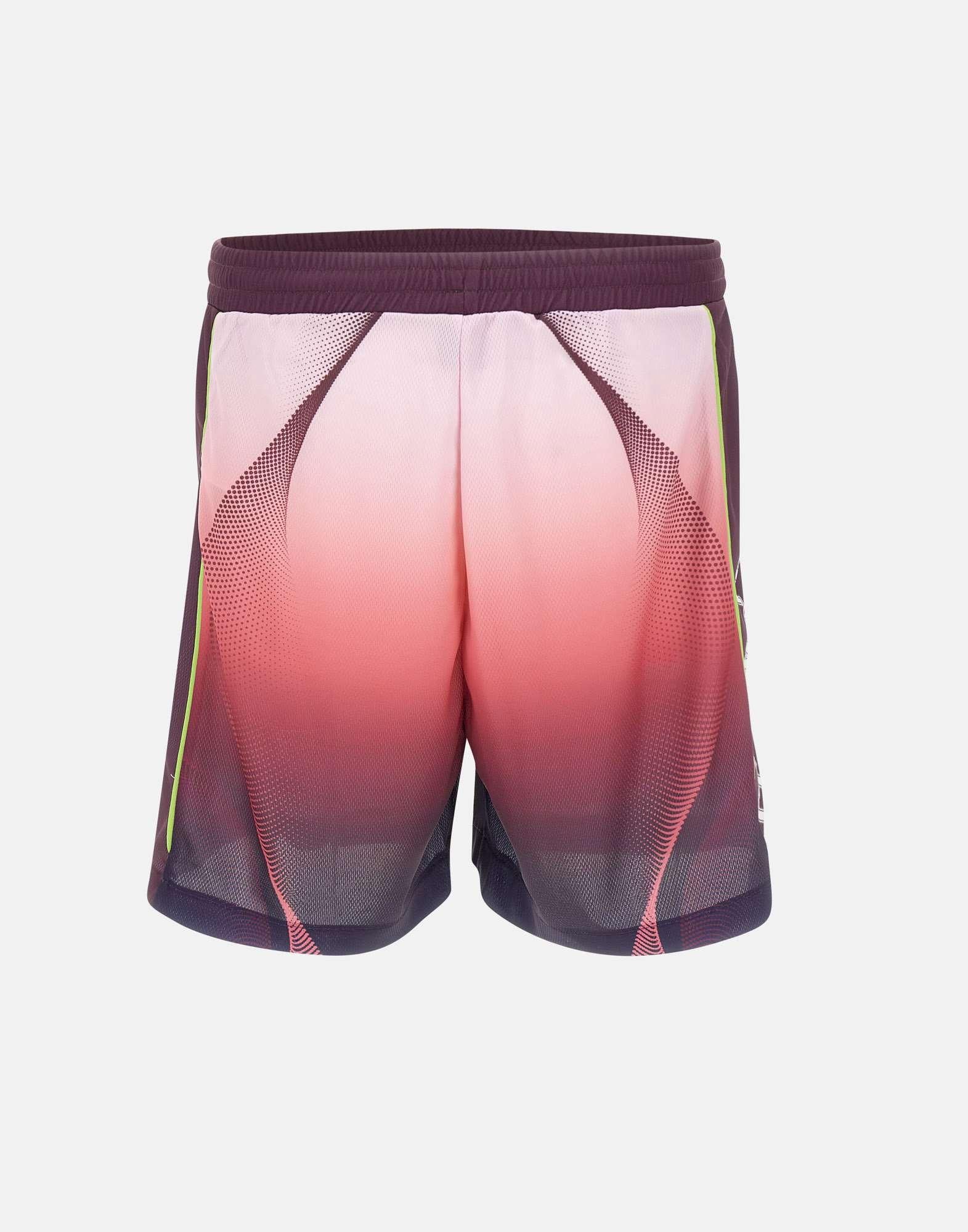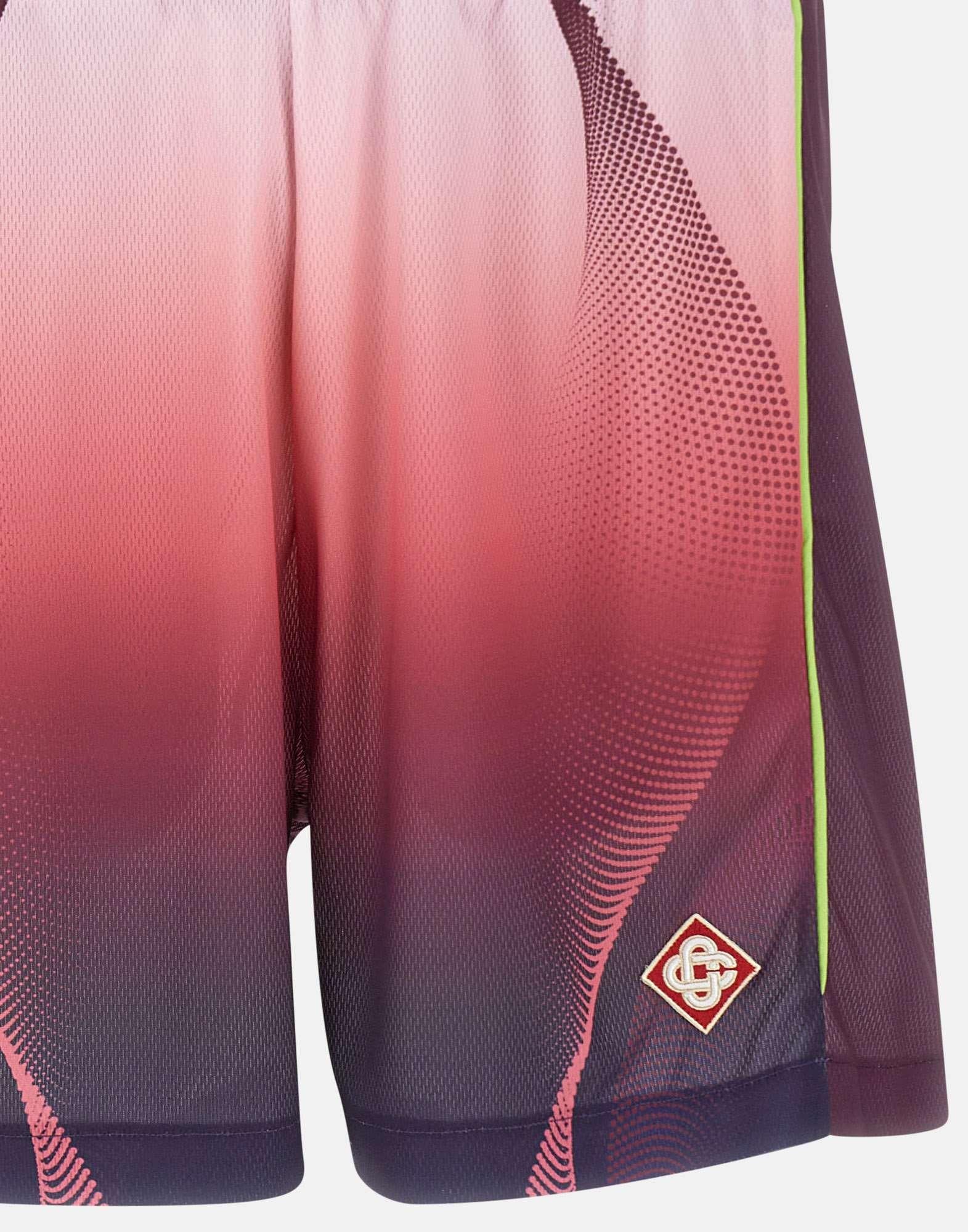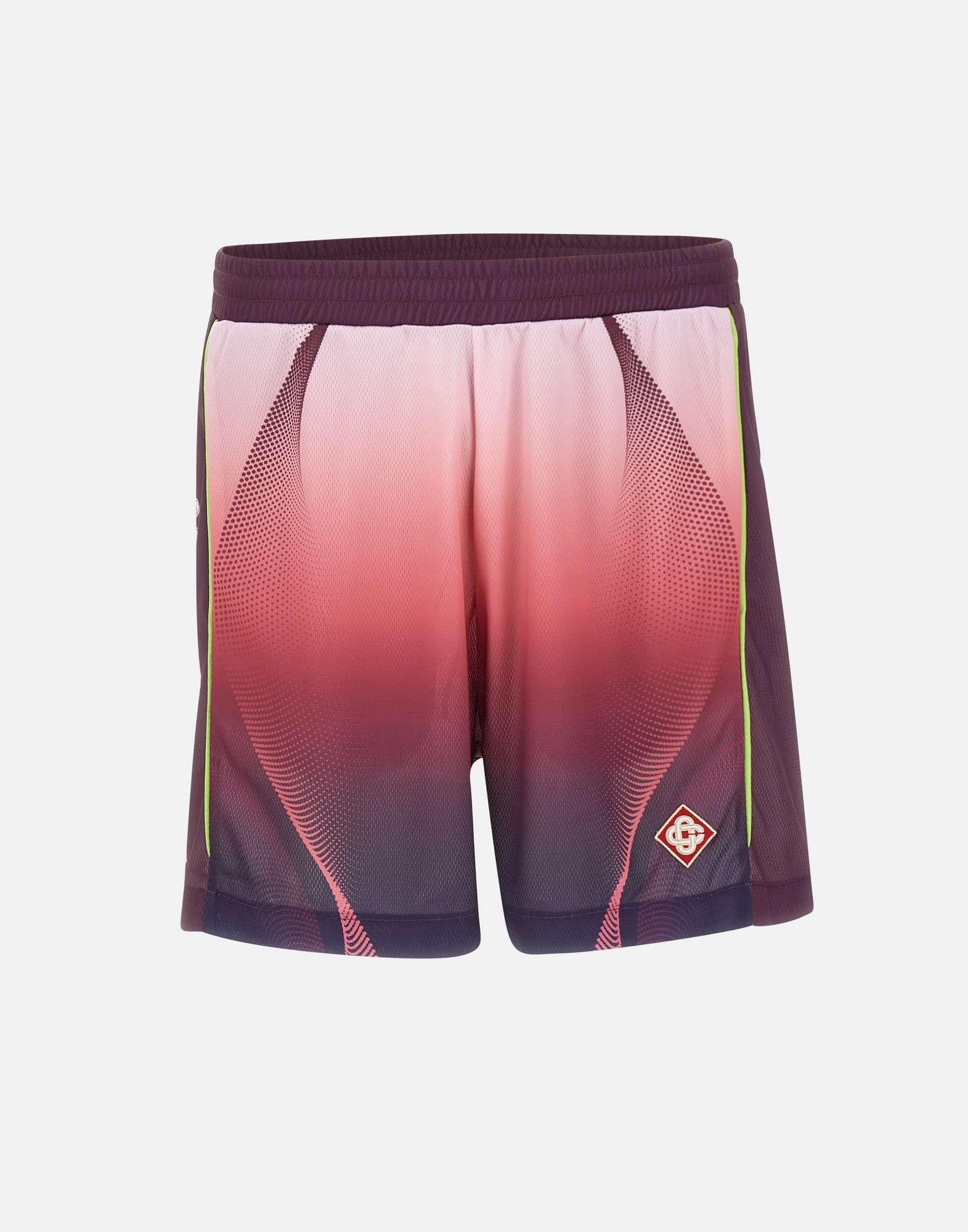 Shorts uomo Casablanca realizzati in tessuto a rete stampato a occhi di pernice con grafica sfumata dal rosa al color melanzana, pensati per un look sportivo e contemporaneo dal gusto luxury. Questo modello da calcio unisce stile distintivo e comfort, ideale per outfit casual ricercati. La vita elasticizzata con coulisse assicura una regolazione pratica, mentre le tasche laterali inserite nelle cuciture mantengono una linea pulita e funzionale. Sul fondo della gamba sinistra spicca la toppa con logo a diamante, simbolo iconico Casablanca. La vestibilità rilassata completa questi shorts con un fit comodo e versatile.