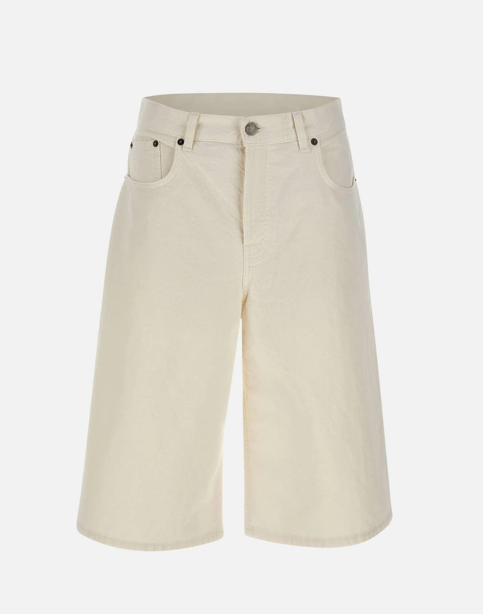 Shorts donna Haikure “New Becky Twill” realizzati in misto cotone e lino color bianco, pensati per un look estivo essenziale dal gusto contemporaneo. Il modello cinque tasche presenta vita alta e taglio bermuda con lunghezza al ginocchio, per una linea pulita e versatile. La chiusura con bottoni coperti da patta mantiene il design minimale, mentre la patch logo in pelle sul retro della cintura firma il capo con discrezione. Ampiezza fondo: 31 cm. Vestibilità regolare, ideale per styling casual. Made in Italy.