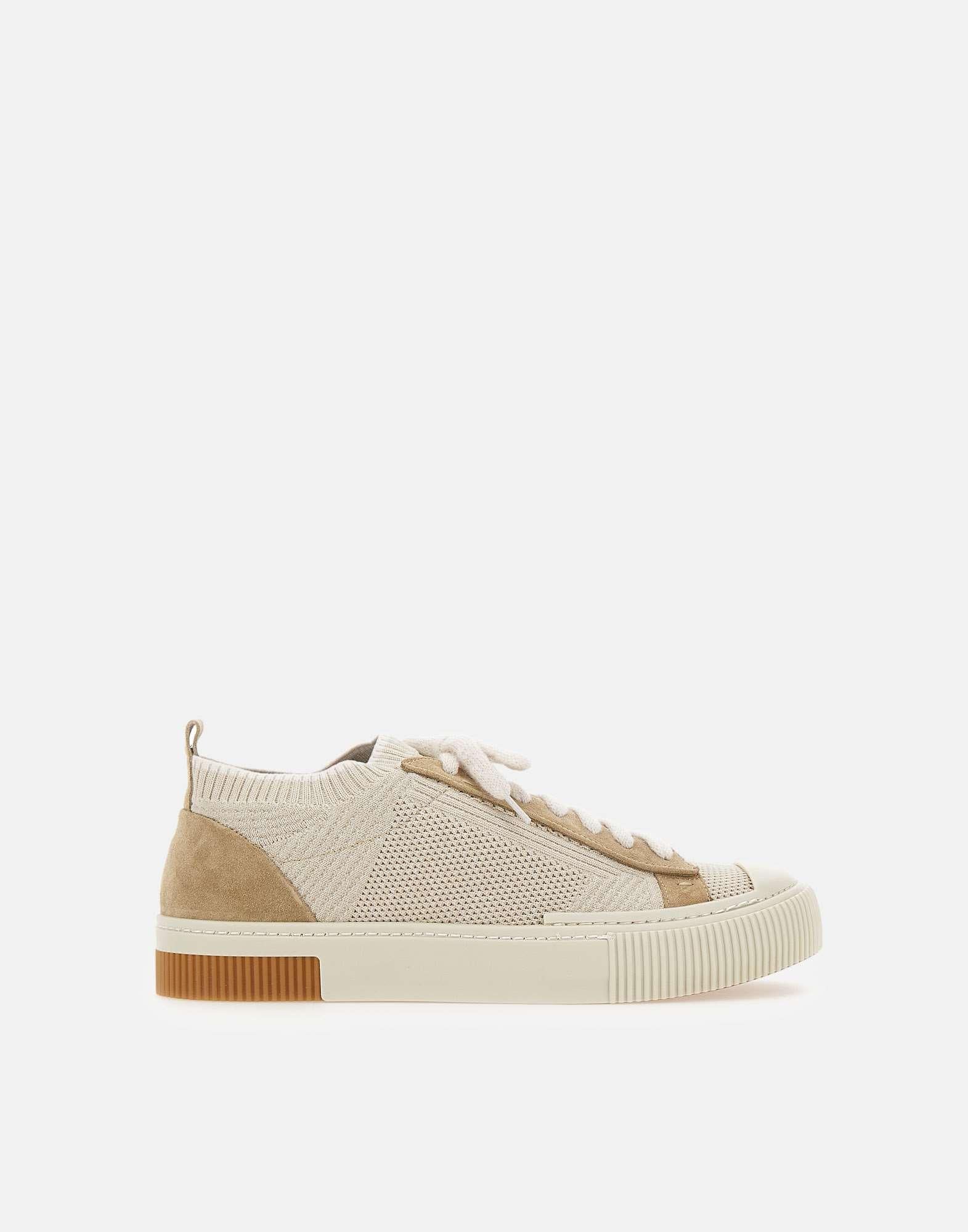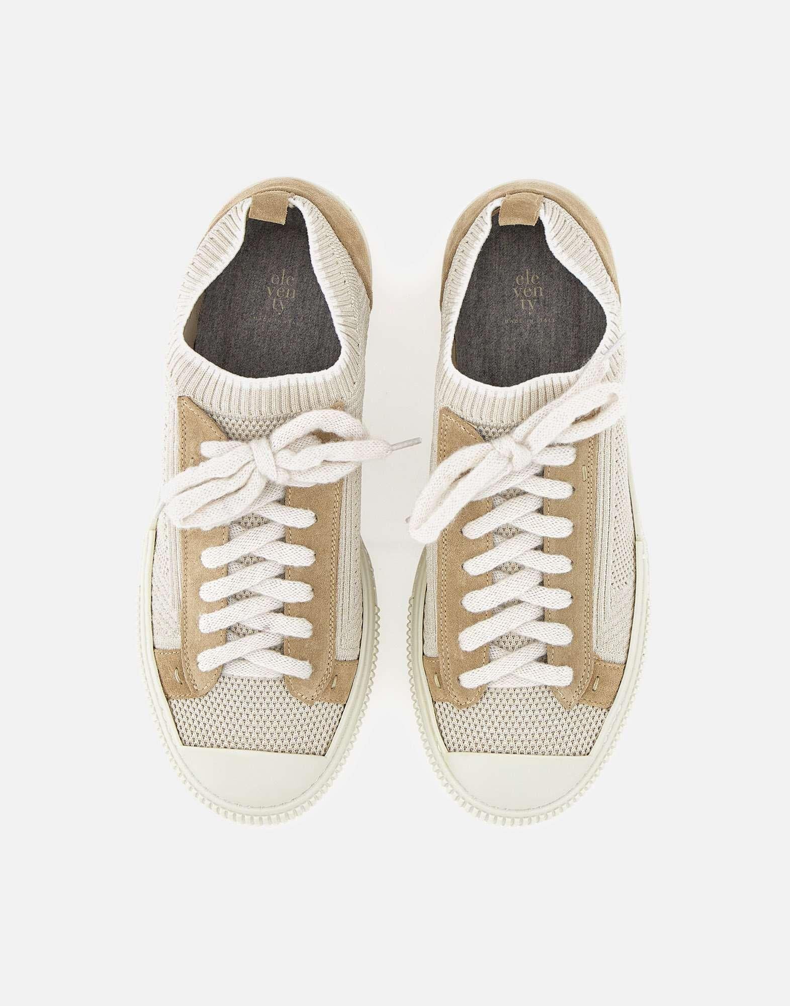 Sneakers Eleventy in maglia, sabbia, trama a rete, lacci morbidi, inserti in camoscio, tirante sul retro, punta tonda, suola light dentellata altezza 4cm, calzata regolare, impunture a vista, custodia inclusa, made in Italy