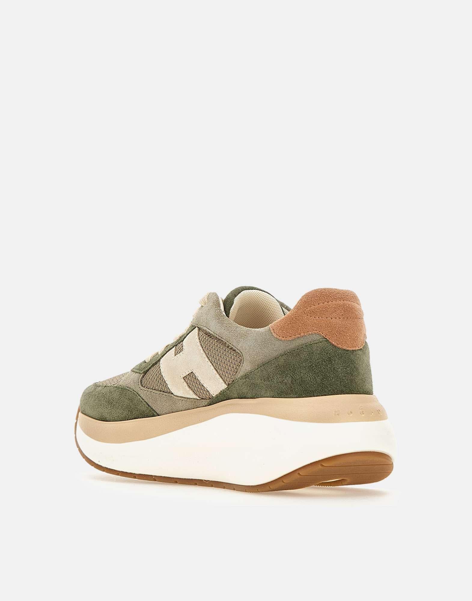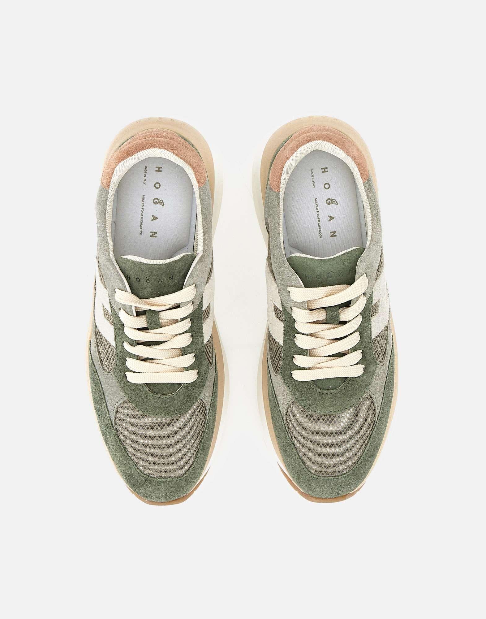 Sneakers donna Hogan “Maxi I Active” in pelle scamosciata nei toni del verde e grigio, con talloncino rosa antico e lacci piatti color panna. La tomaia, dalle linee morbide e arrotondoate, è arricchita da inserti in mesh e da una maxi H laterale color grigio chiaro, per un look contemporaneo e distintivo. Il logo Hogan è impresso sulla linguetta e sul tallone. La suola chunky in gomma extralight alta 6,5 cm dona slancio e leggerezza, mentre la soletta in memory foam da 5 mm assicura comfort e ammortizzazione. Design dinamico e sofisticato. Include custodia in tessuto e lacci aggiuntivi color verde. Made in Italy.