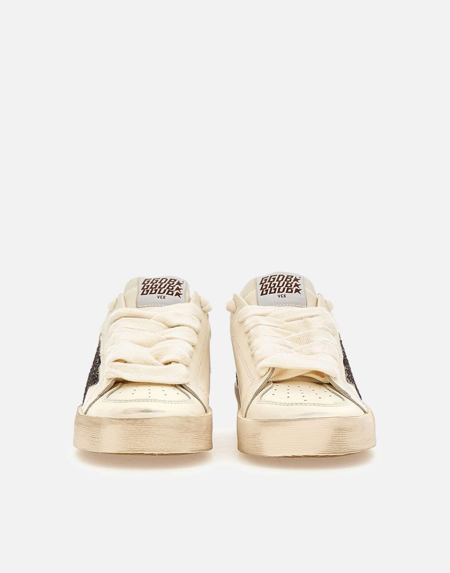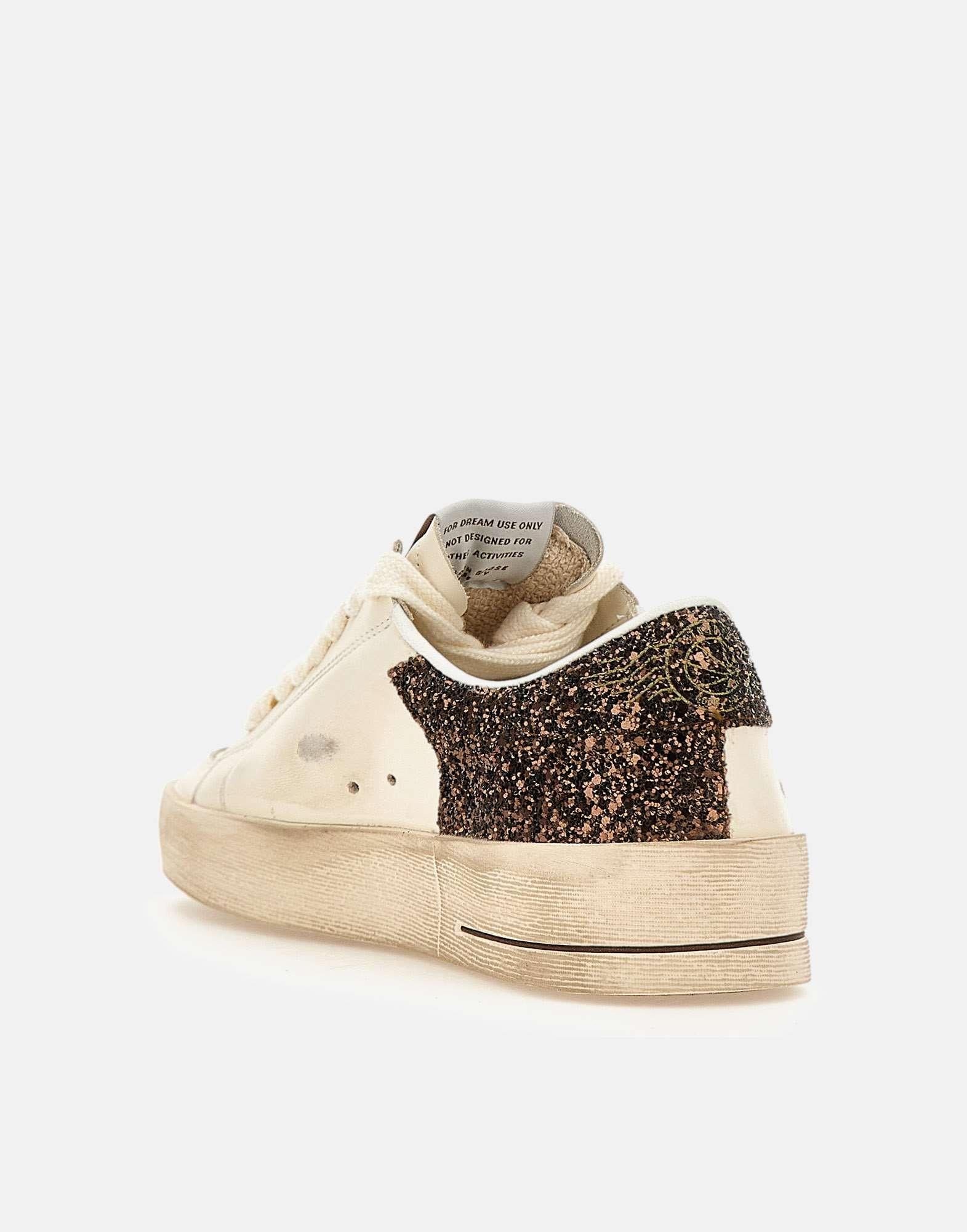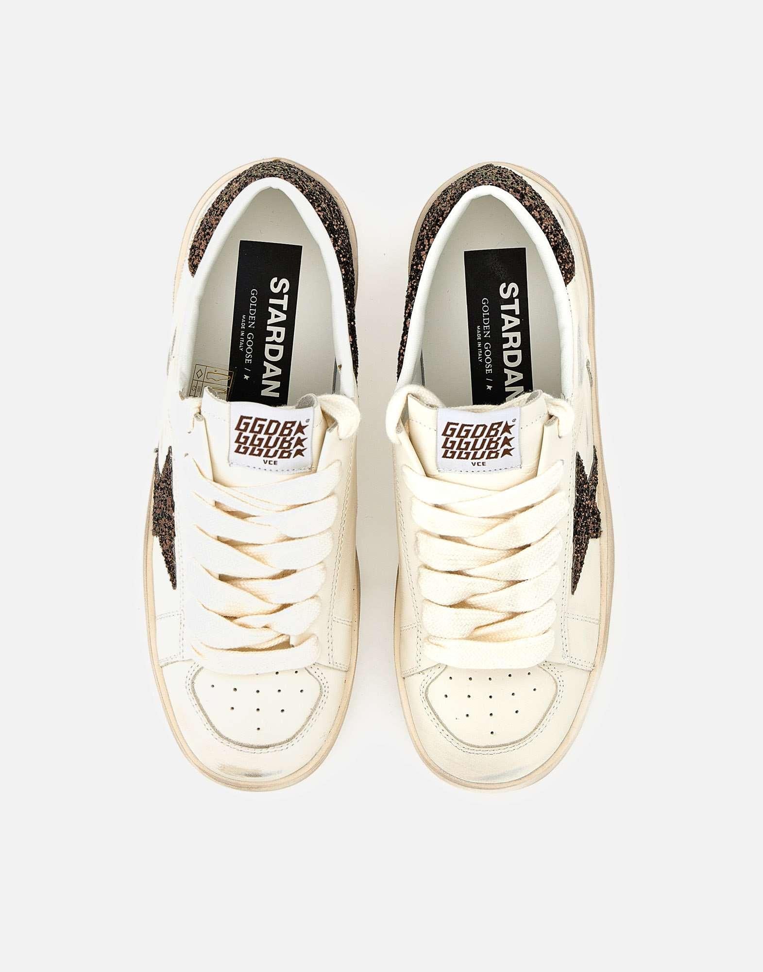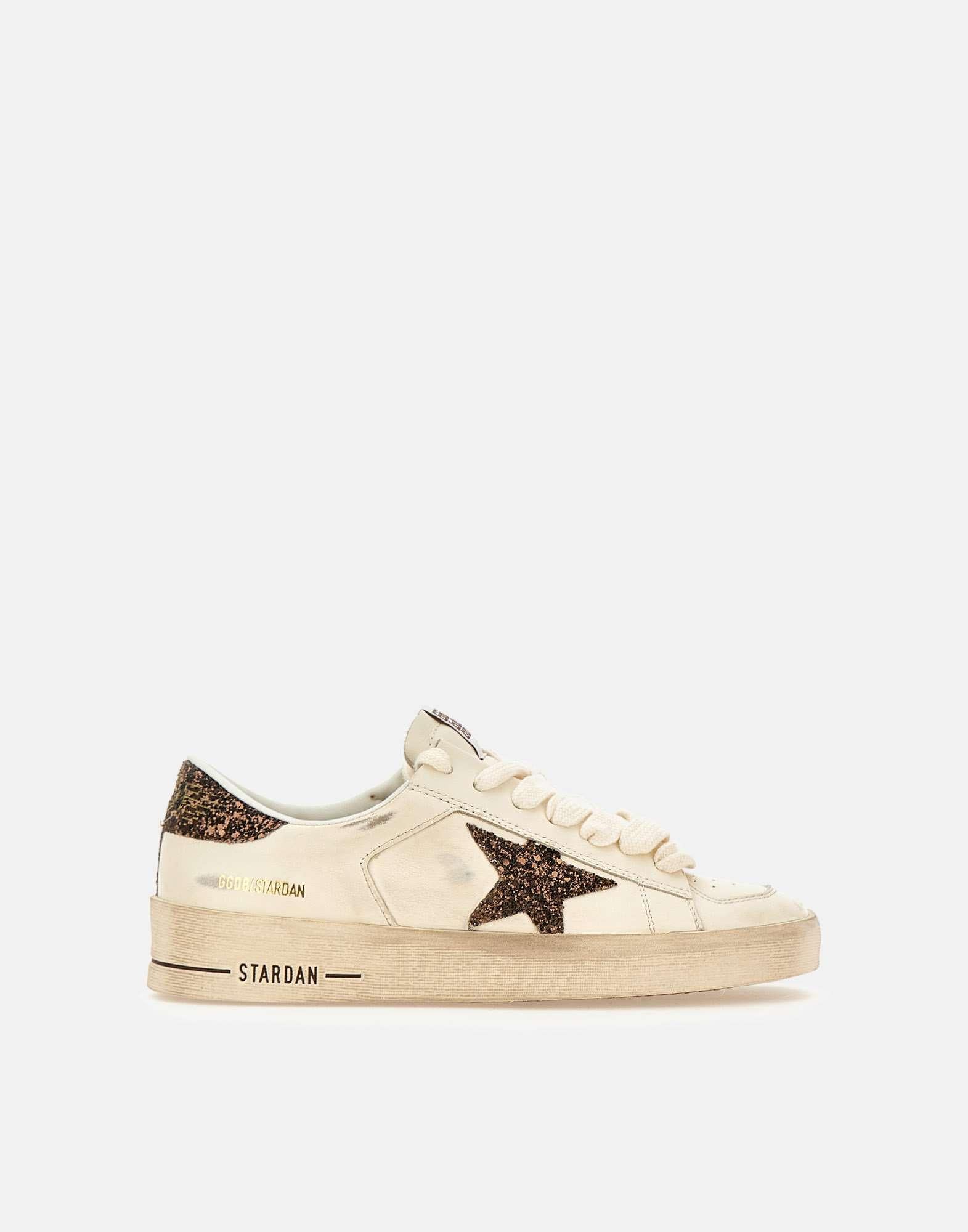 Sneakers donna Golden Goose “Stardan” in pelle bianca, impreziosite da inserti brillantinati color marrone e dalliconico logo stella laterale glitterato. Il modello presenta lacci piatti bianchi, patch logo sulla linguetta, stampa logo sul retro e scritta dorata a lato. La punta forata favorisce la traspirazione, mentre la suola in gomma bianca effetto used, alta 4 cm, dona il tipico look vissuto Golden Goose. Interno in pelle per un comfort superiore. Made in Italy, un mix perfetto di artigianalita, stile e attitudine contemporanea.