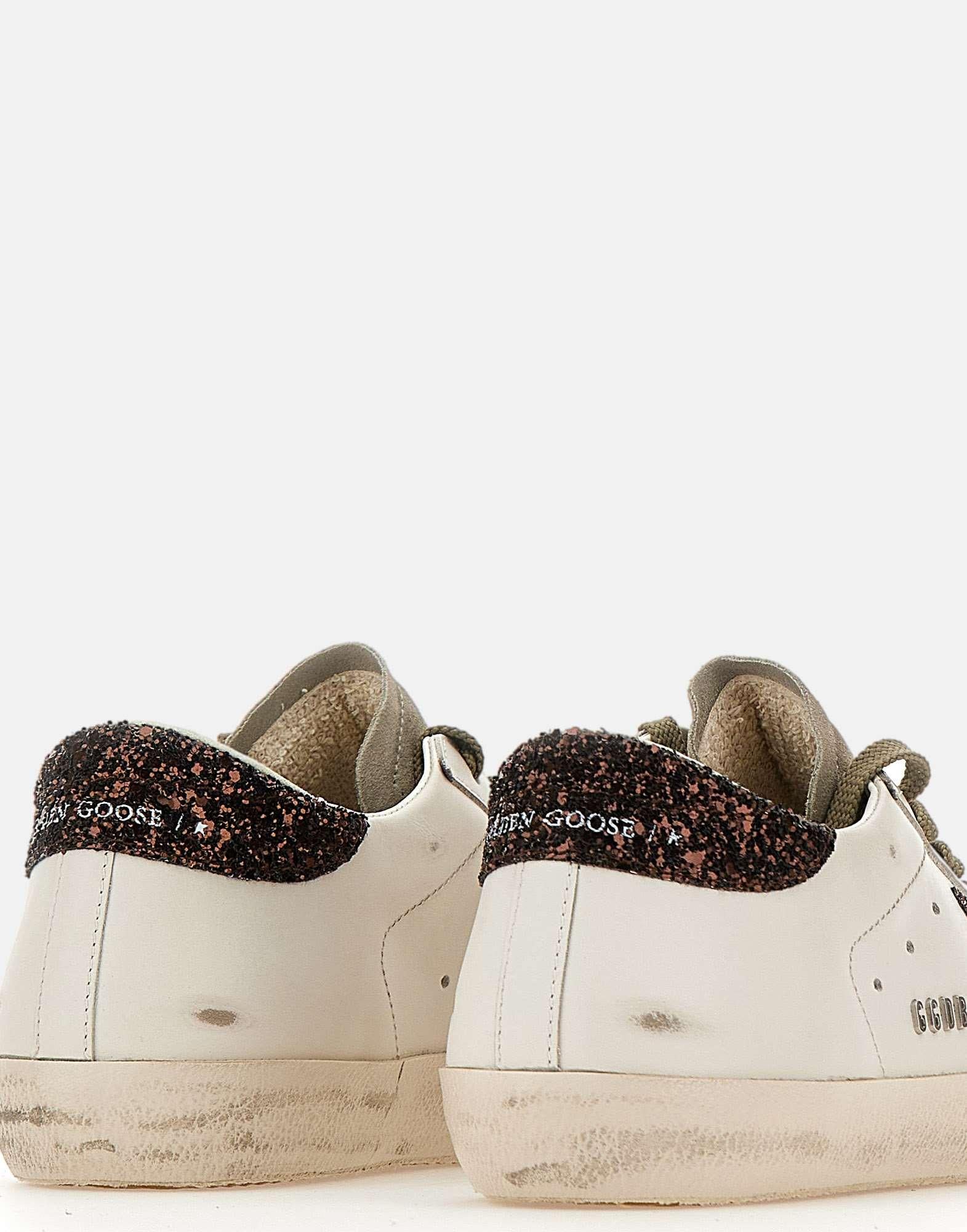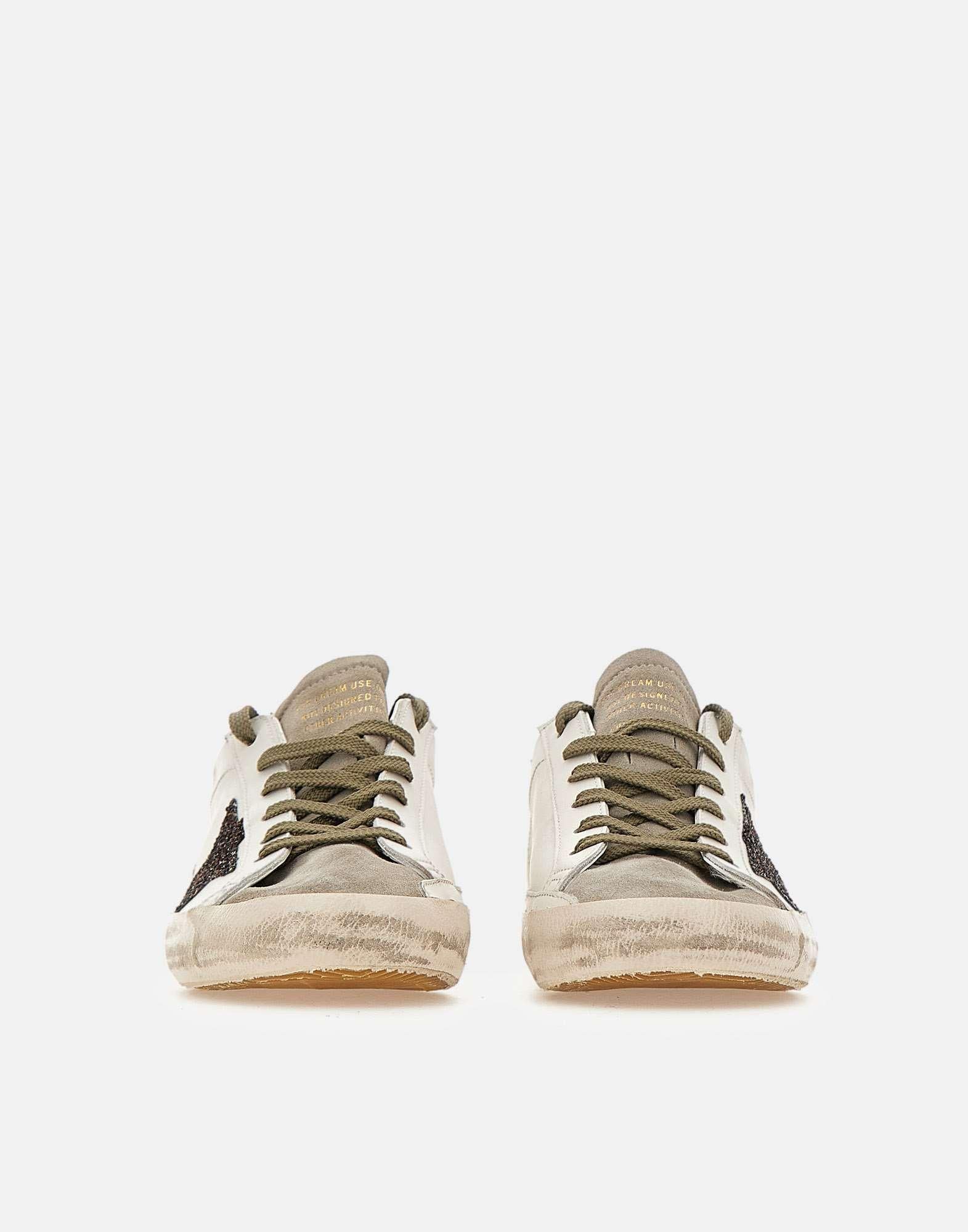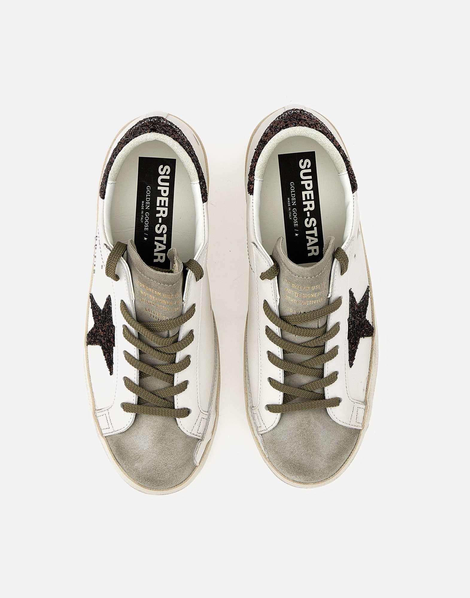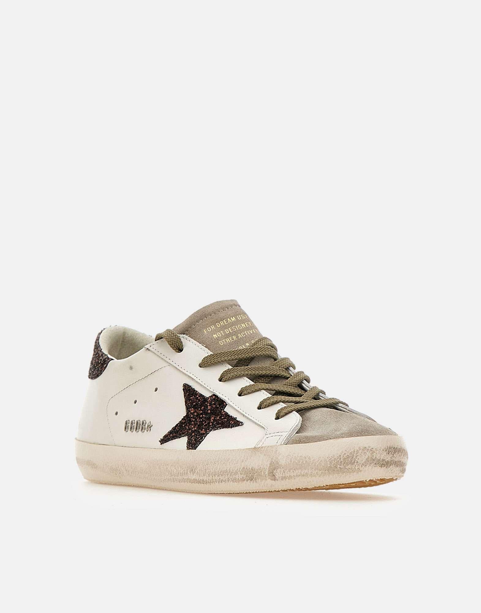 Sneakers donna Golden Goose “Super-Star Classic with List” in pelle color bianco con sporcature effetto vintage, un’icona dal fascino senza tempo in continua evoluzione. Il modello è caratterizzato da stella e talloncino logato in glitter color marrone, per un dettaglio luminoso e distintivo. Punta e linguetta sono in pelle scamosciata grigia, mentre i lacci piatti marroni completano il look con un contrasto caldo. Sul lato esterno è applicato il logo metallico con stellina. Suola in gomma alta 2,5 cm e dust bag inclusa. Made in Italy.