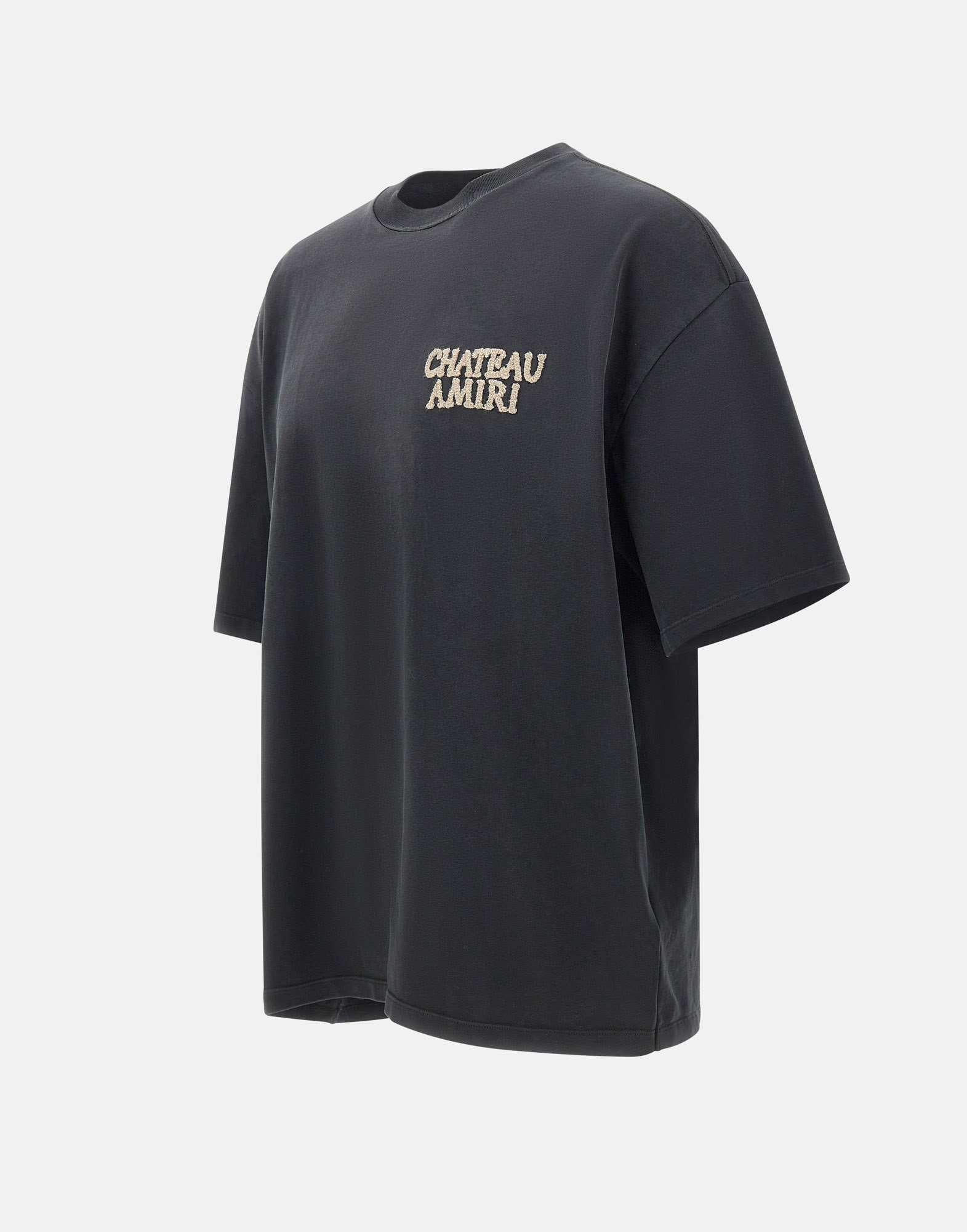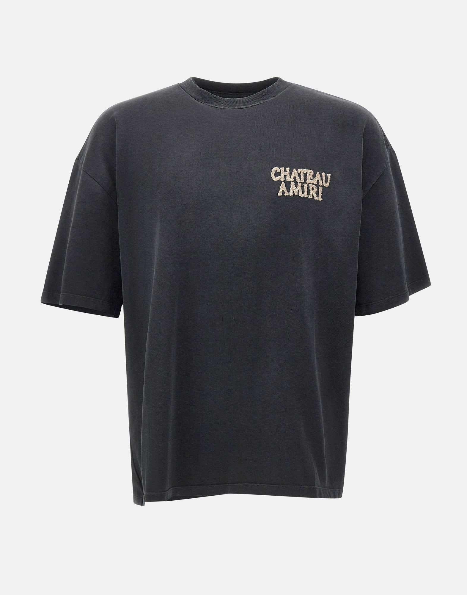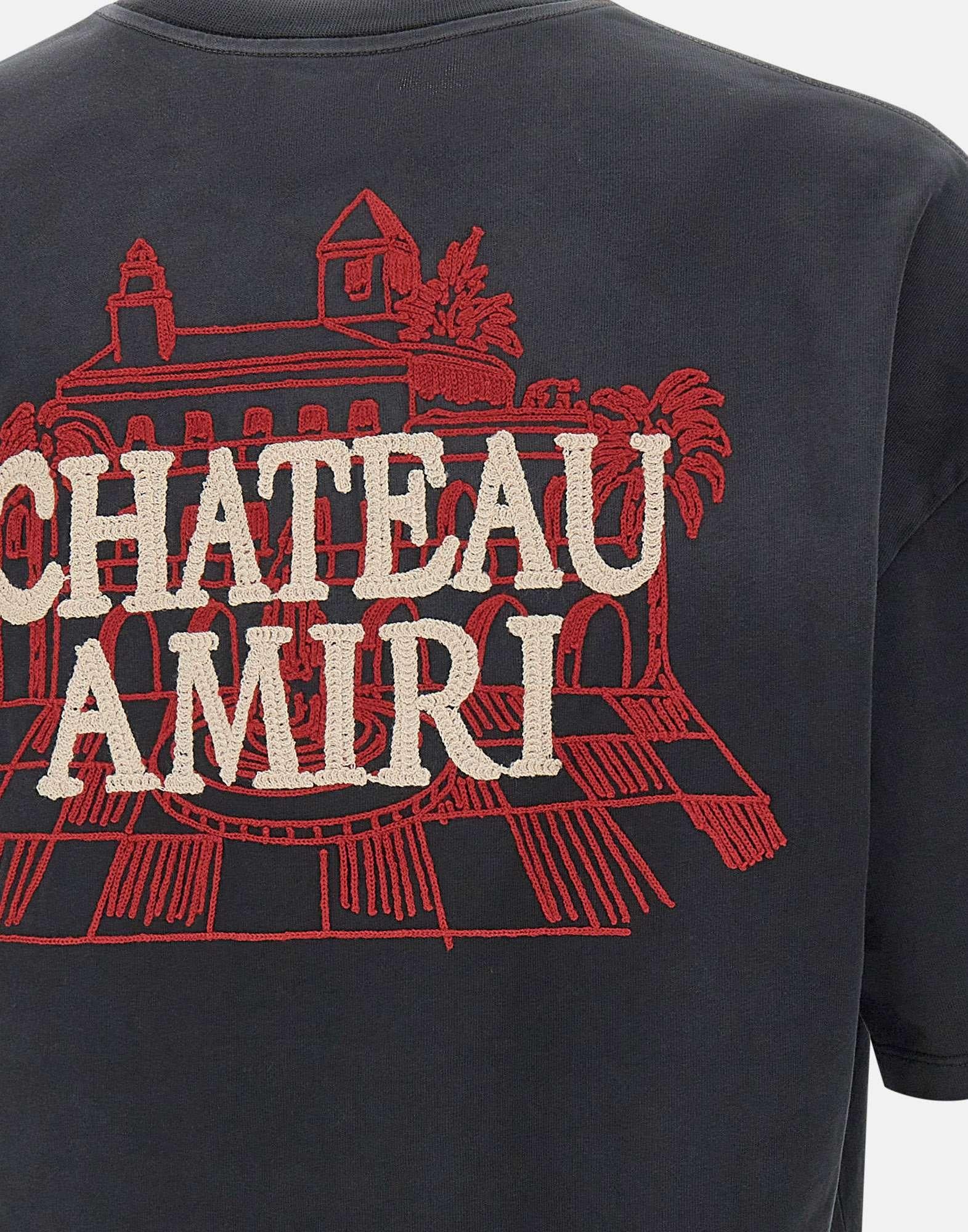 T-shirt uomo Amiri “Chateau Amiri” realizzata in cotone color nero leggermente sbiadito, pensata per uno stile deciso dal gusto contemporaneo. Il modello presenta maniche corte e girocollo a costine, mentre i ricami definiscono il design con forte impatto visivo: ricamo beige sul petto e grande ricamo rosso e beige sulla schiena. La vestibilità over enfatizza una silhouette ampia e rilassata, ideale per look streetwear dal carattere distintivo. Un capo iconico che unisce artigianalità e attitudine moderna, made in Italy.