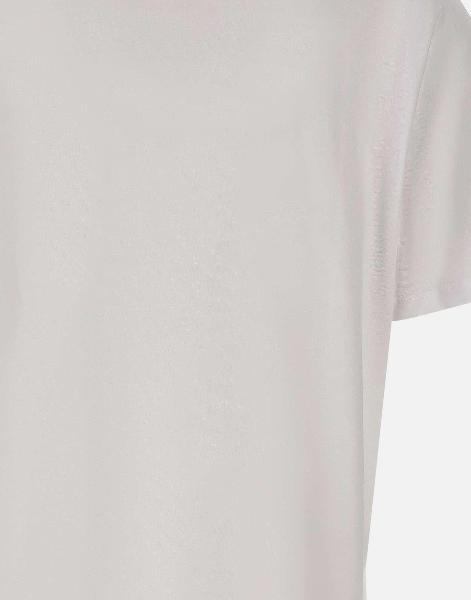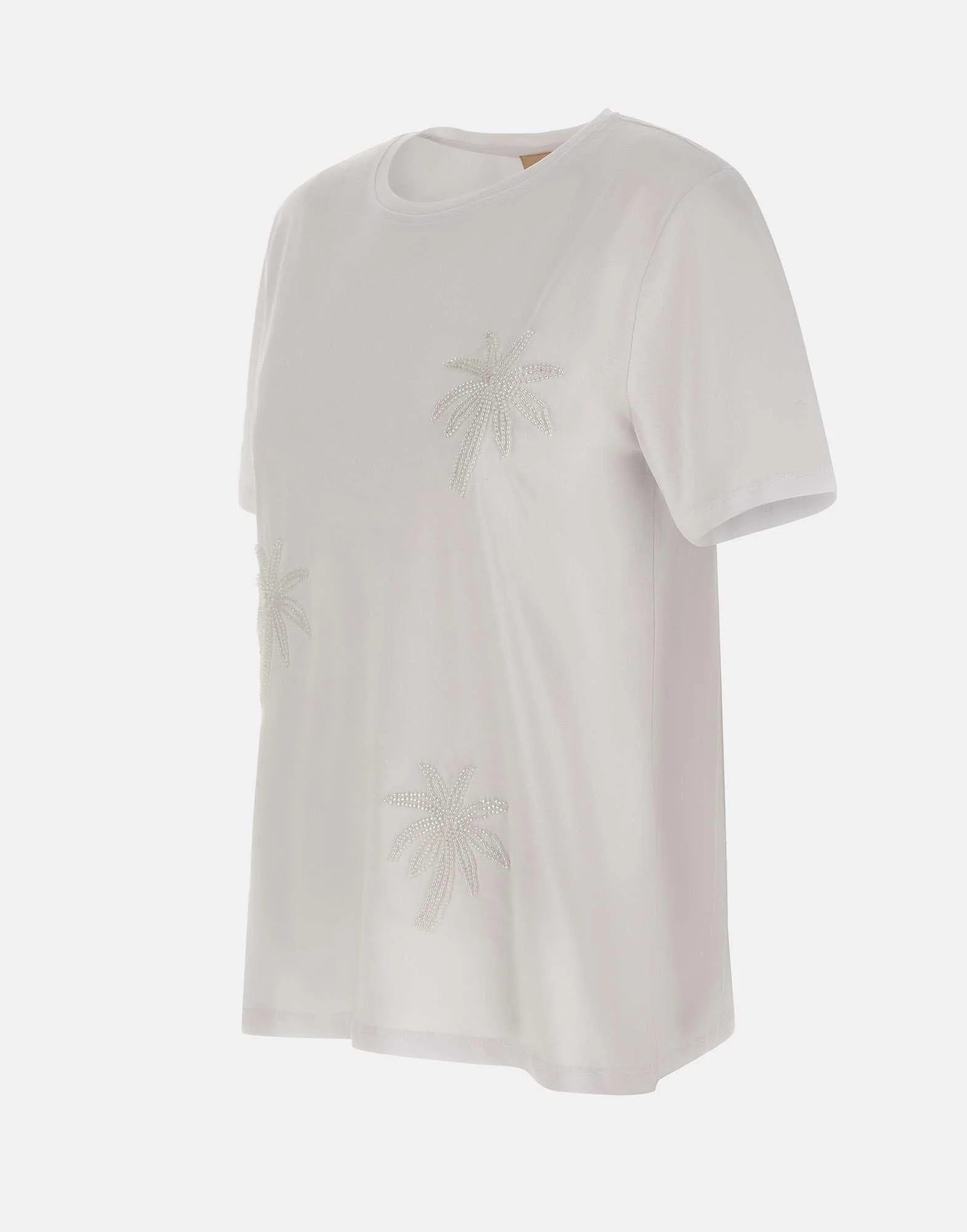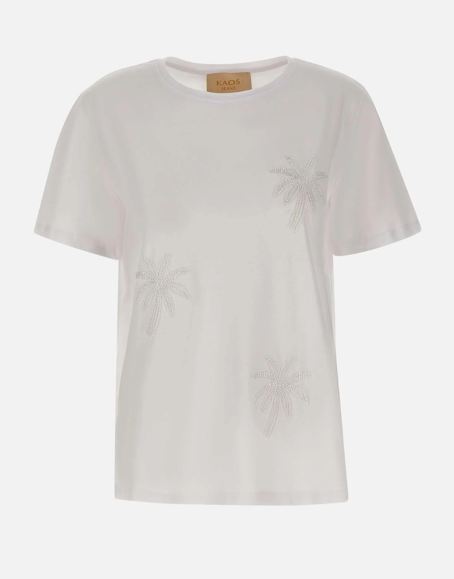 T-shirt donna Kaos, linea Kaos Jeans, realizzata in cotone bianco, caratterizzata da un design casual dal gusto luminoso e contemporaneo. Il modello presenta maniche corte e girocollo, dettagli essenziali che ne esaltano la versatilità e la facilità di abbinamento. Le palme ricamate con lustrini aggiungono un accento decorativo ricercato, donando al capo un tocco distintivo e dinamico. Vestibilità rilassata.