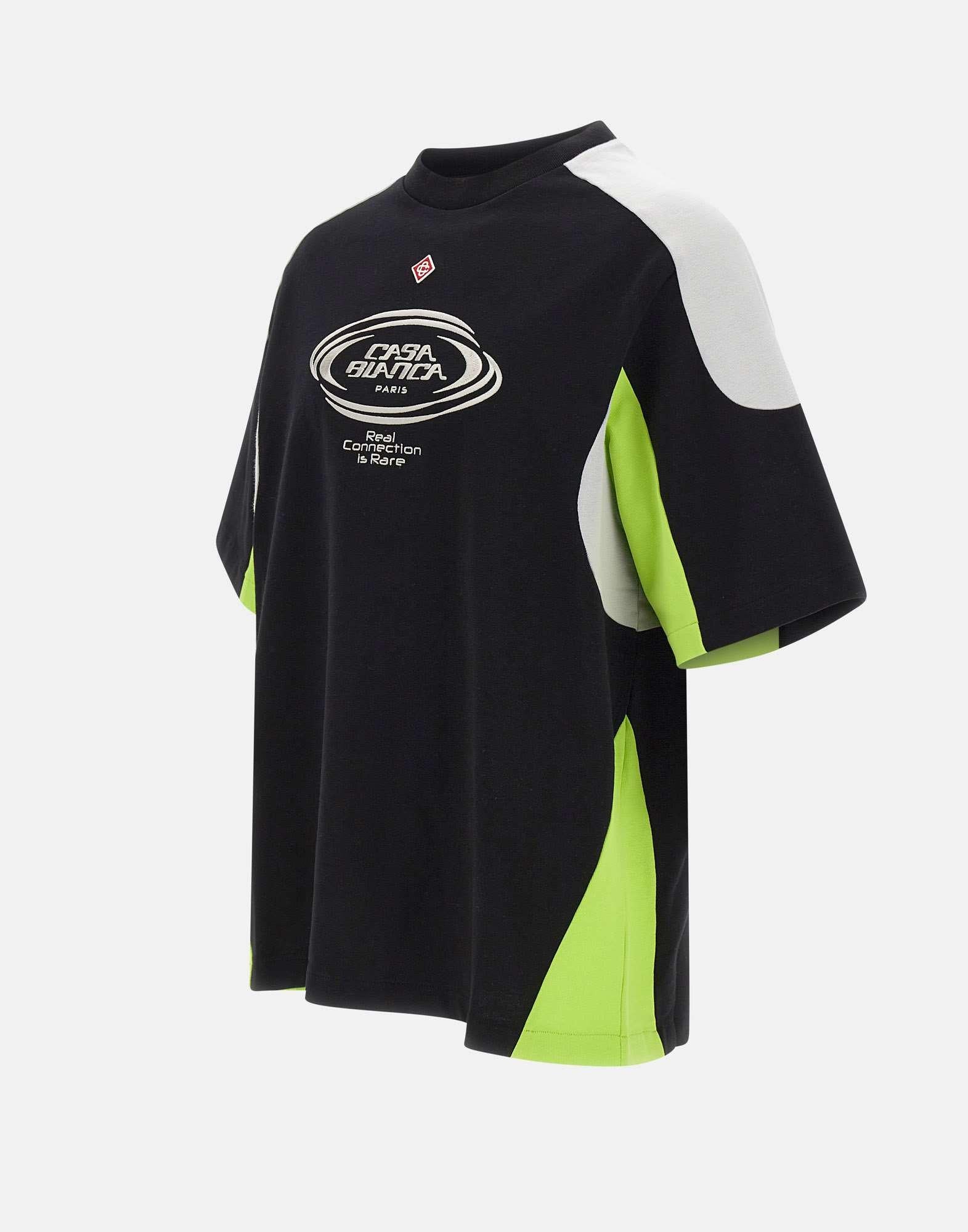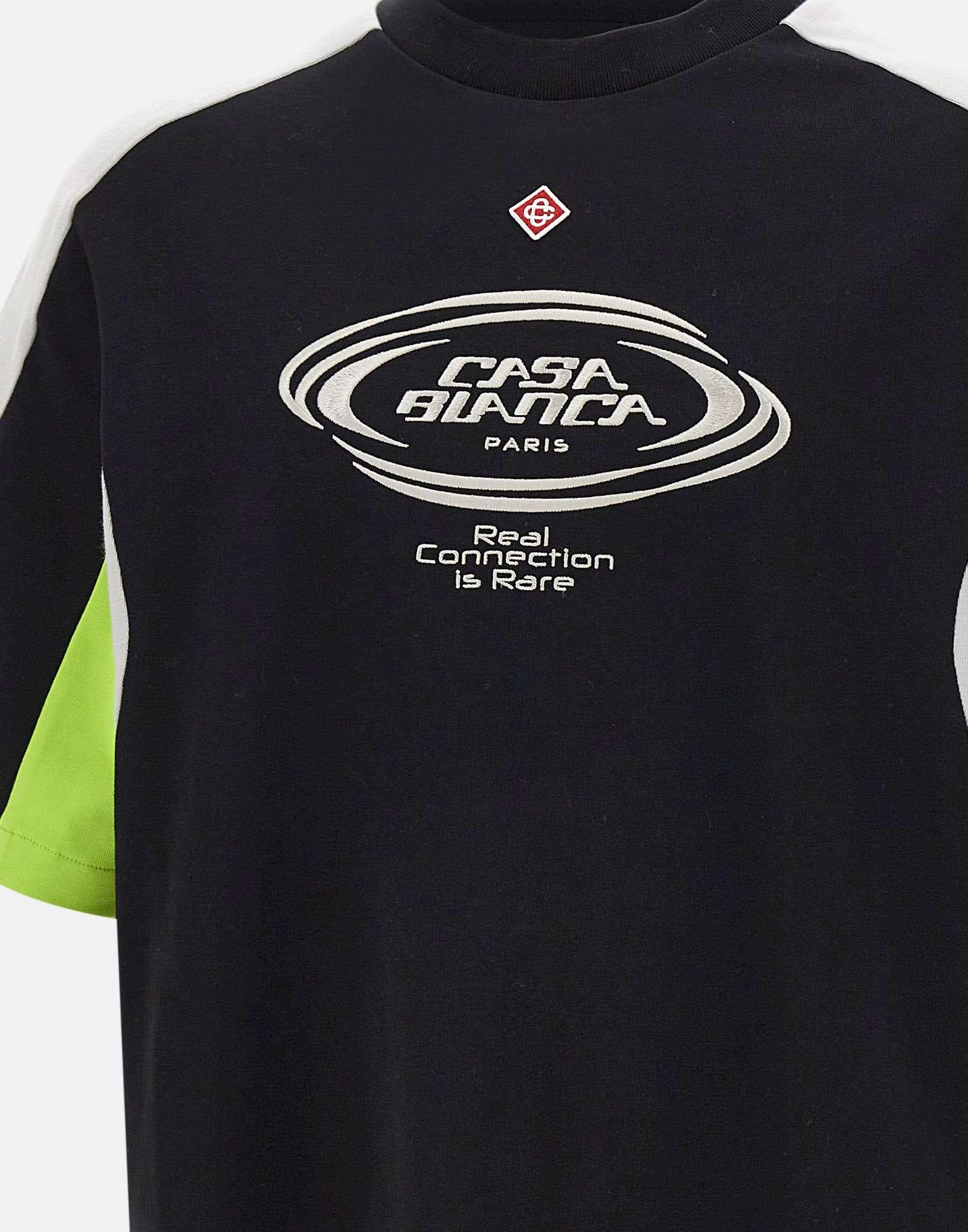 T-shirt uomo Casablanca realizzata in cotone biologico color nero, pensata per un look contemporaneo dal carattere luxury. Questa t-shirt a maniche corte presenta una silhouette oversize e un design distintivo: un motivo color block con il logo a forma di diamante, simbolo della maison, al centro del petto. Lo scollo rotondo a costine rifinisce la linea con un taglio classico, mentre il logo Casablanca ricamato sul petto aggiunge un ulteriore dettaglio iconico. Una t-shirt oversize perfetta per outfit casual con identità decisa e stile premium.