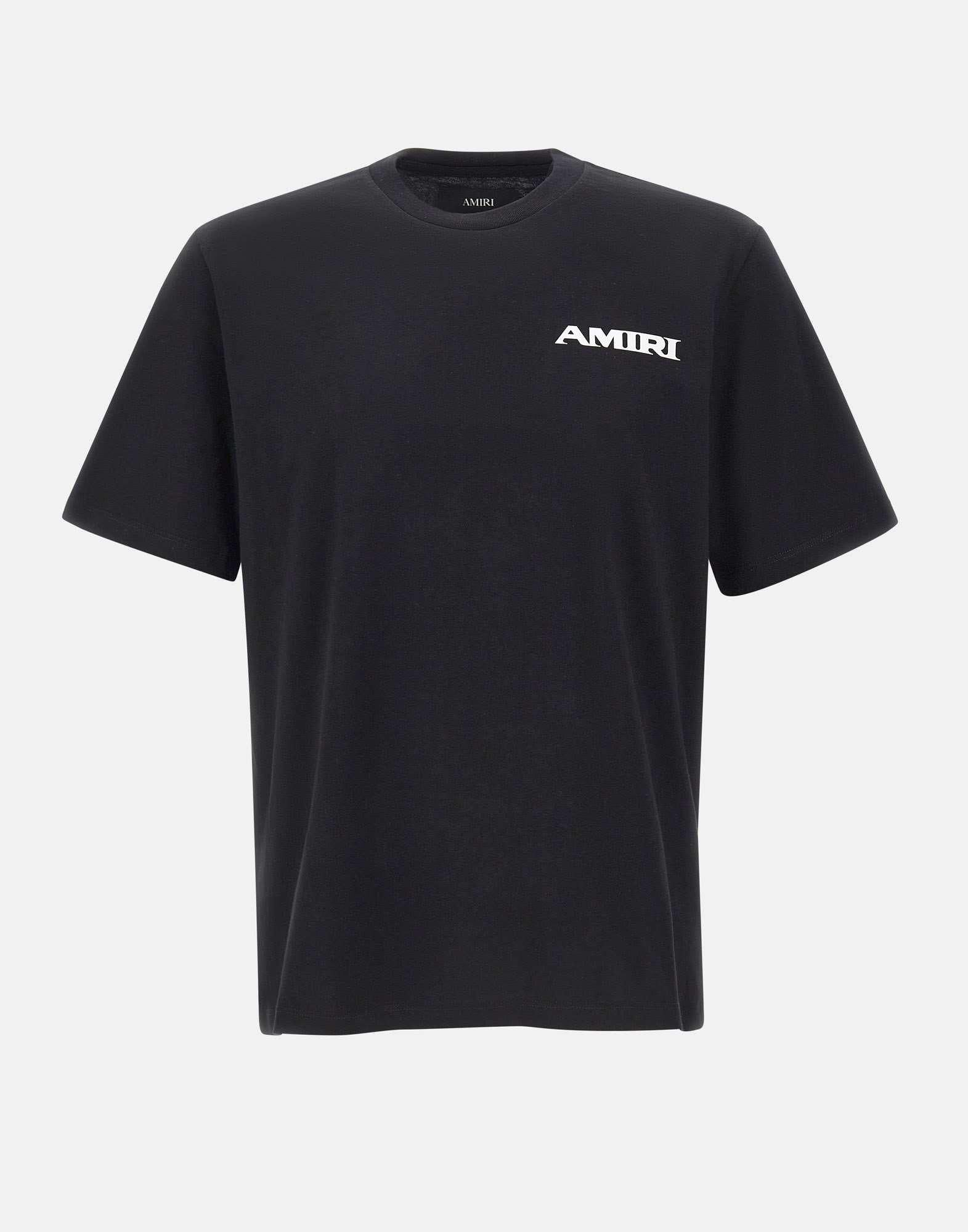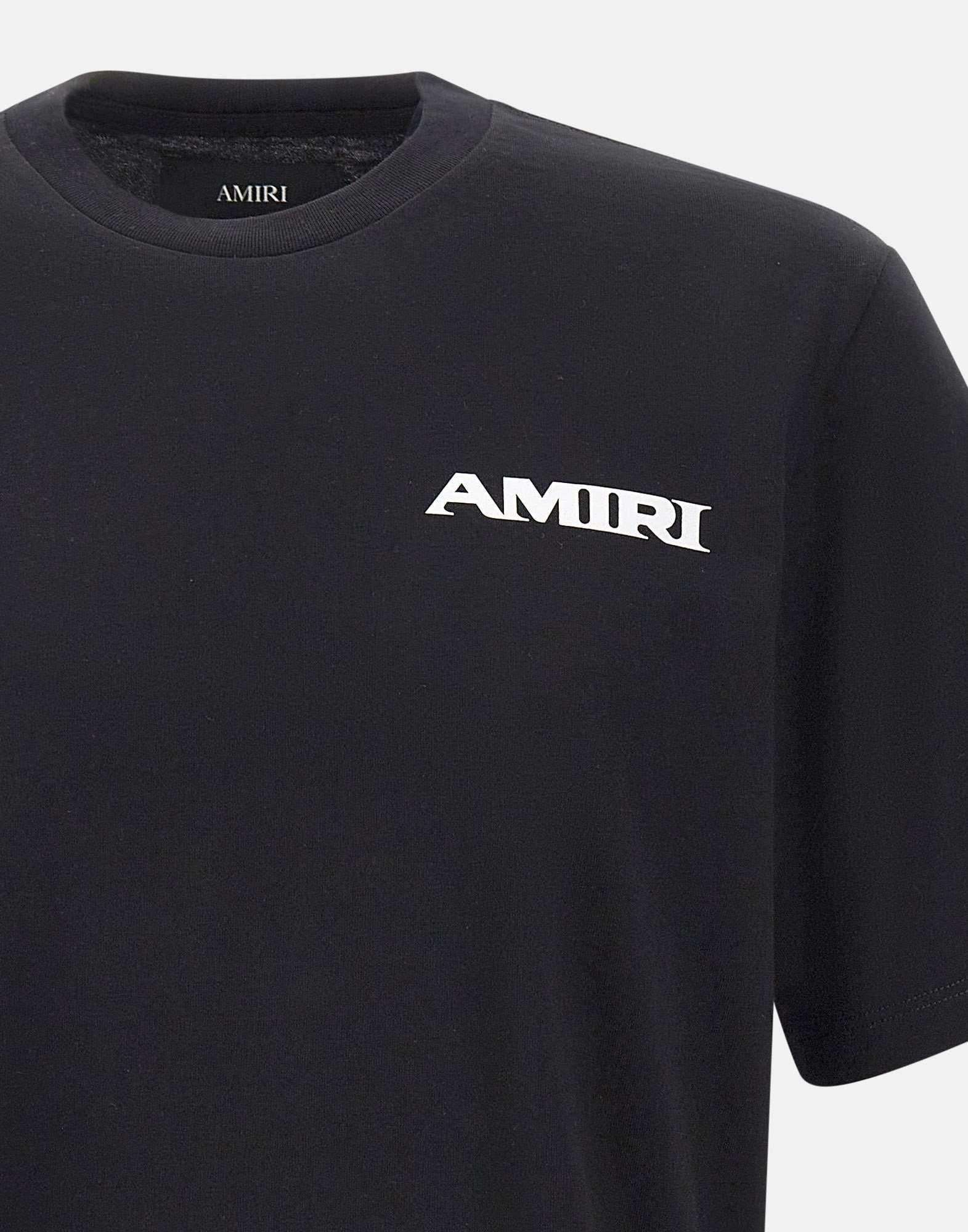 T-shirt uomo Amiri realizzata in cotone nero, caratterizzata da maniche corte e girocollo a costine. Il modello è decorato sul petto da una grafica di stagione in contrasto bianco, ispirata ai classici dell’abbigliamento sportivo degli anni ’80. I motivi grafici reinterpretano il logo della maison in chiave contemporanea, mantenendo un’estetica decisa e riconoscibile. La vestibilità dritta garantisce comfort e versatilità per l’uso quotidiano