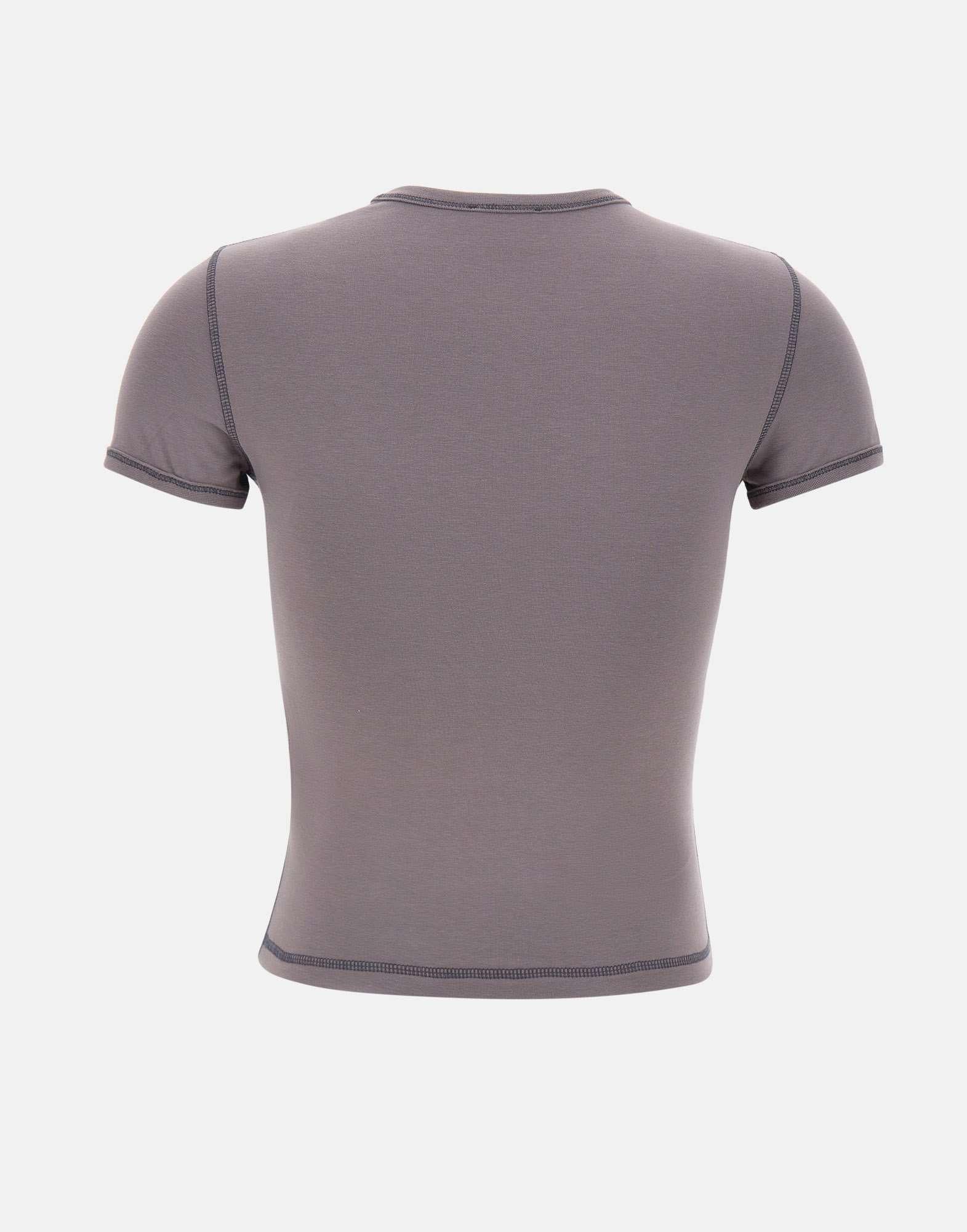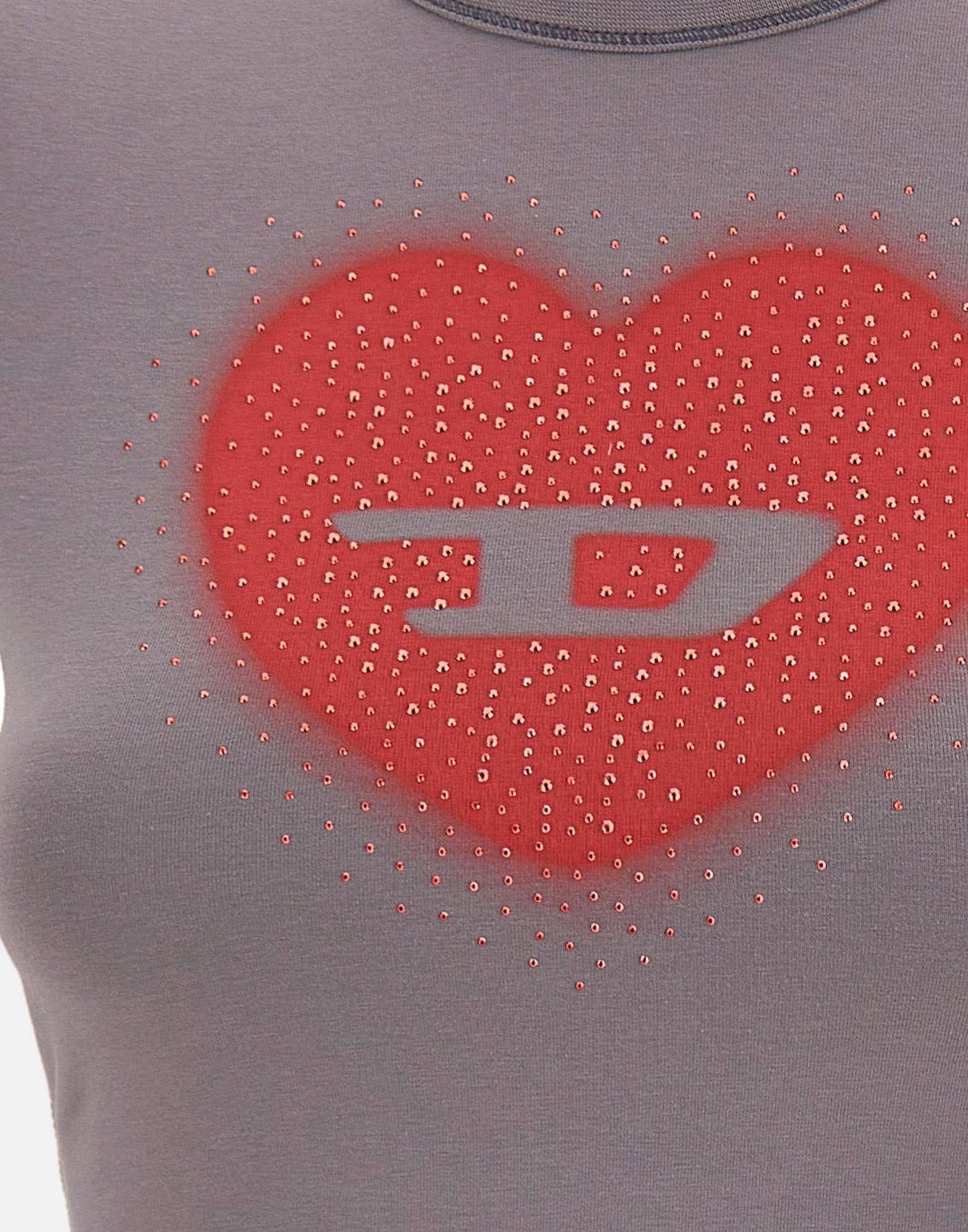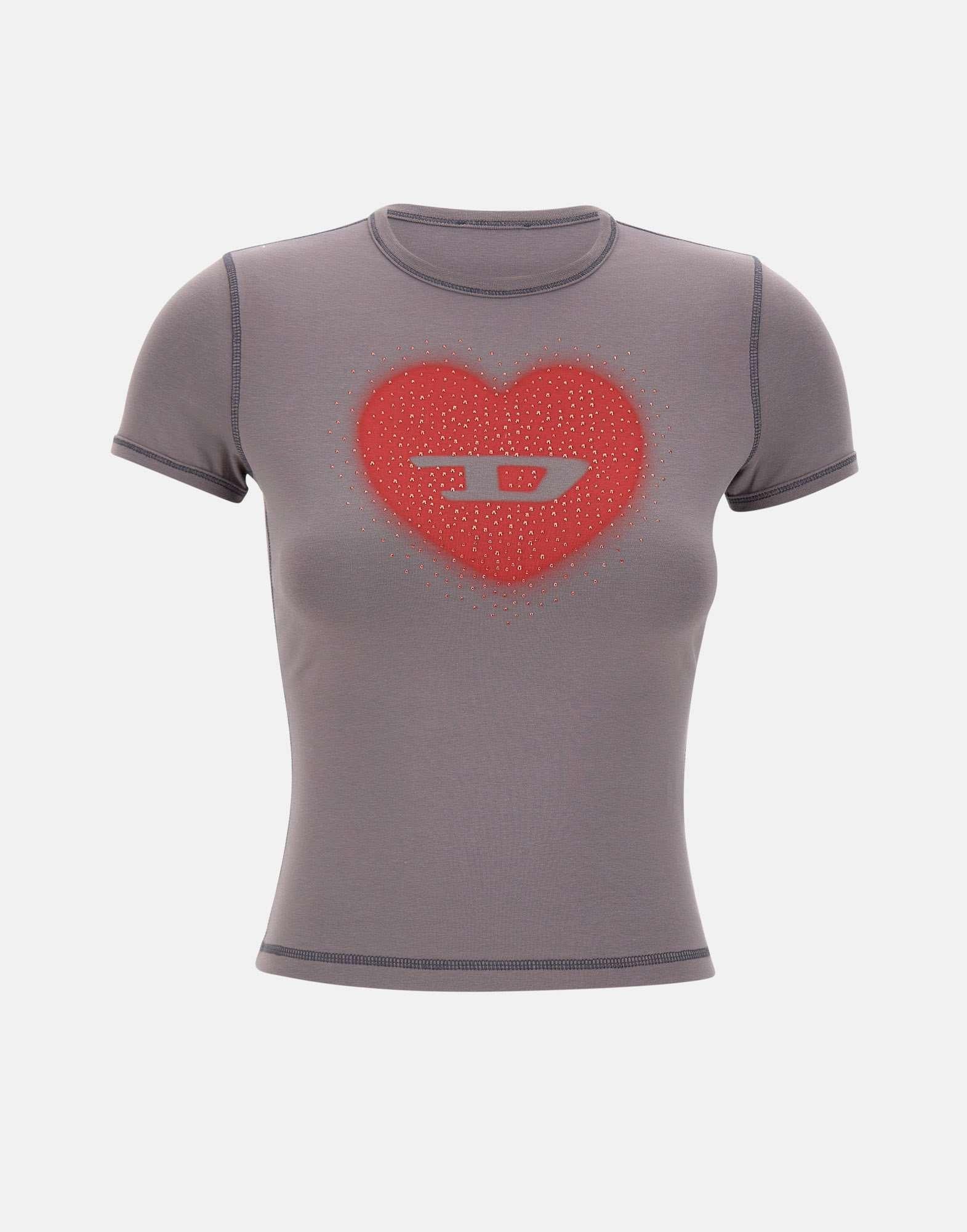 T-shirt donna Diesel “T-Uncuties-Long-S5” in jersey elasticizzato di cotone grigio. Modello slim fit con girocollo e maniche corte, impreziosito da una stampa digitale rossa a forma di cuore con logo D e micro borchie applicate sul davanti. Le cuciture di copertura tono su tono rifiniscono il design essenziale e contemporaneo.