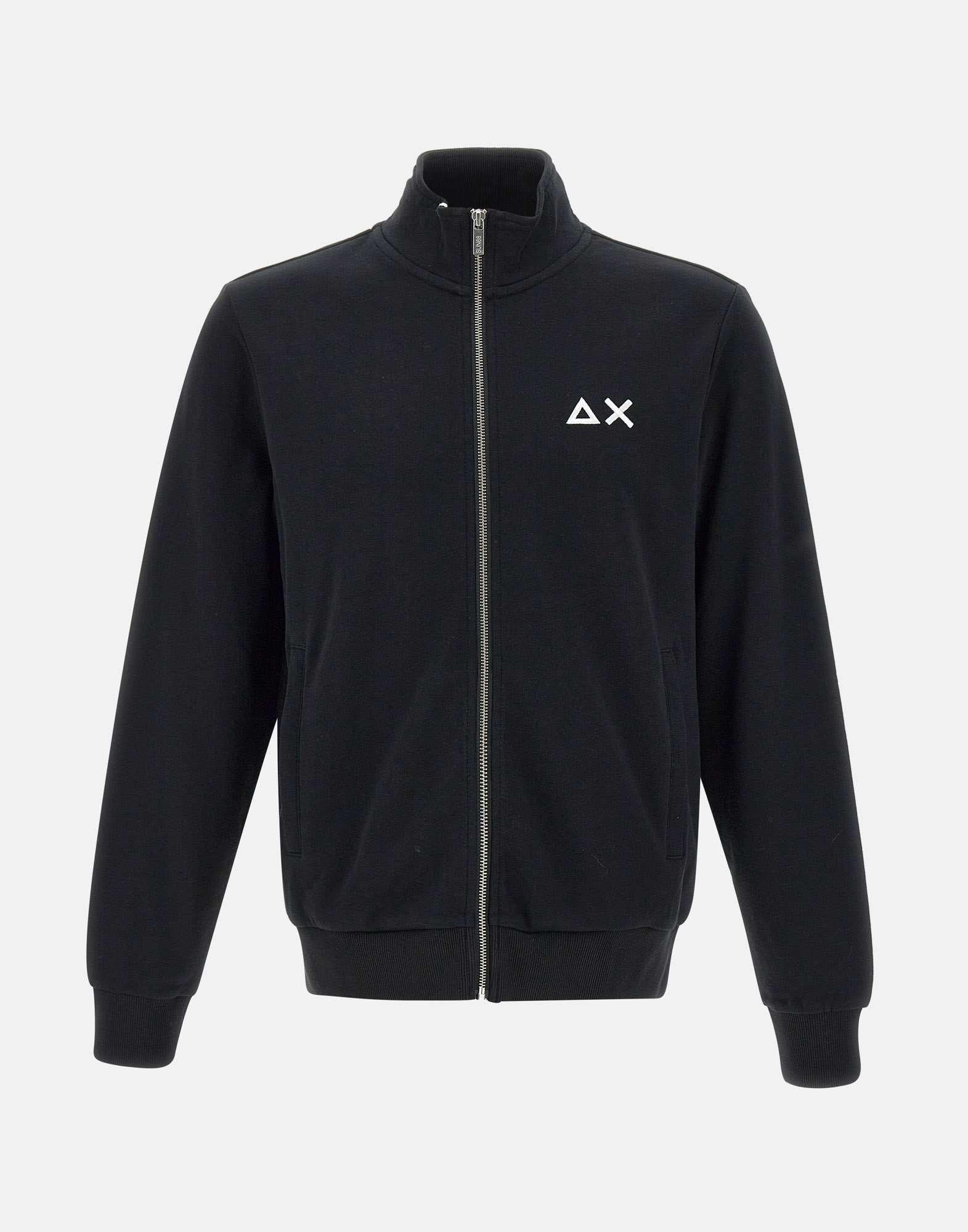 “Track zip basic fleece” uomo Sun68, colore nero, misto cotone, colletto alto, tasche laterali con zip, chiusura fill zip, logo ricamato sul petto, bordi a costine, interno garzato, regular fit