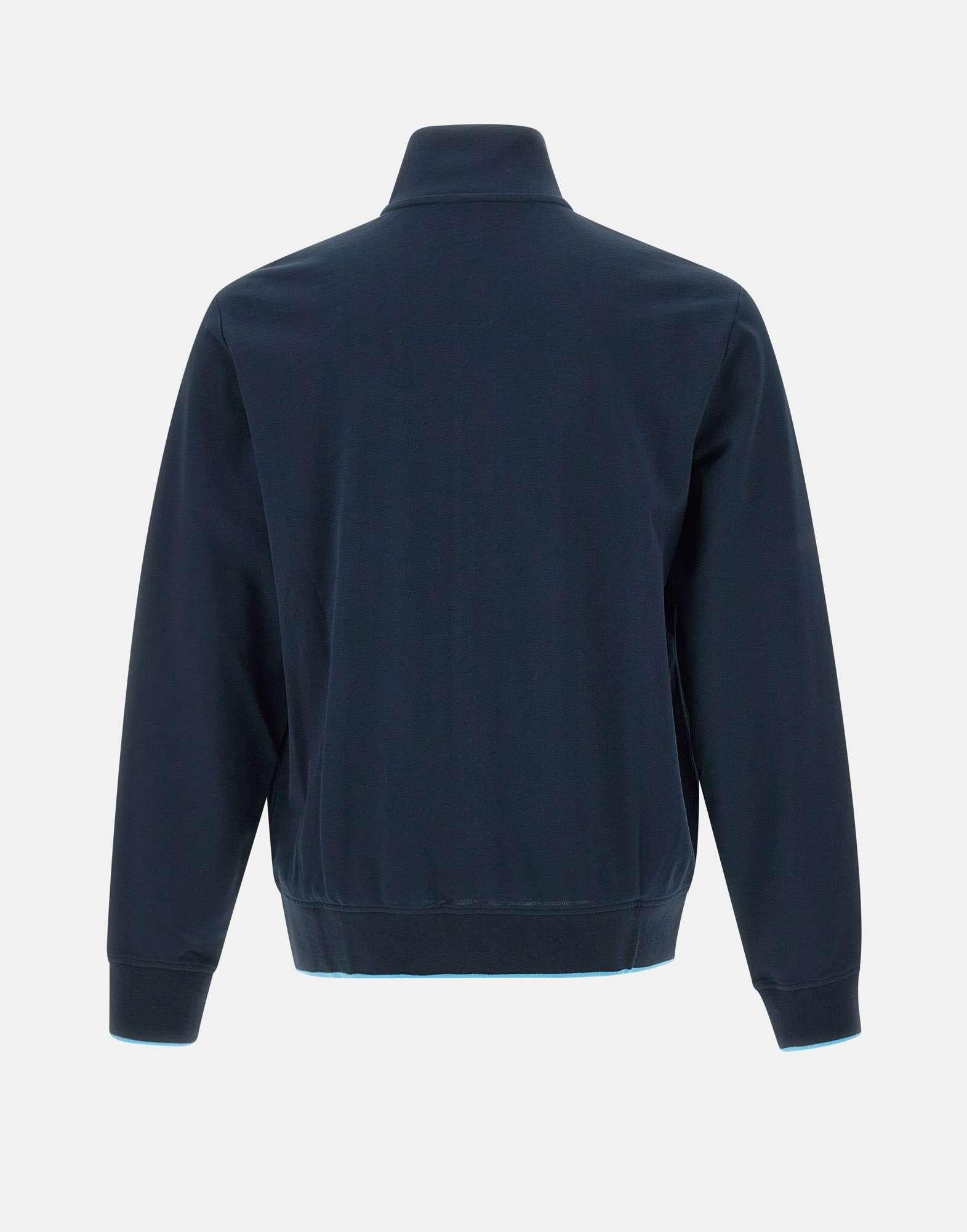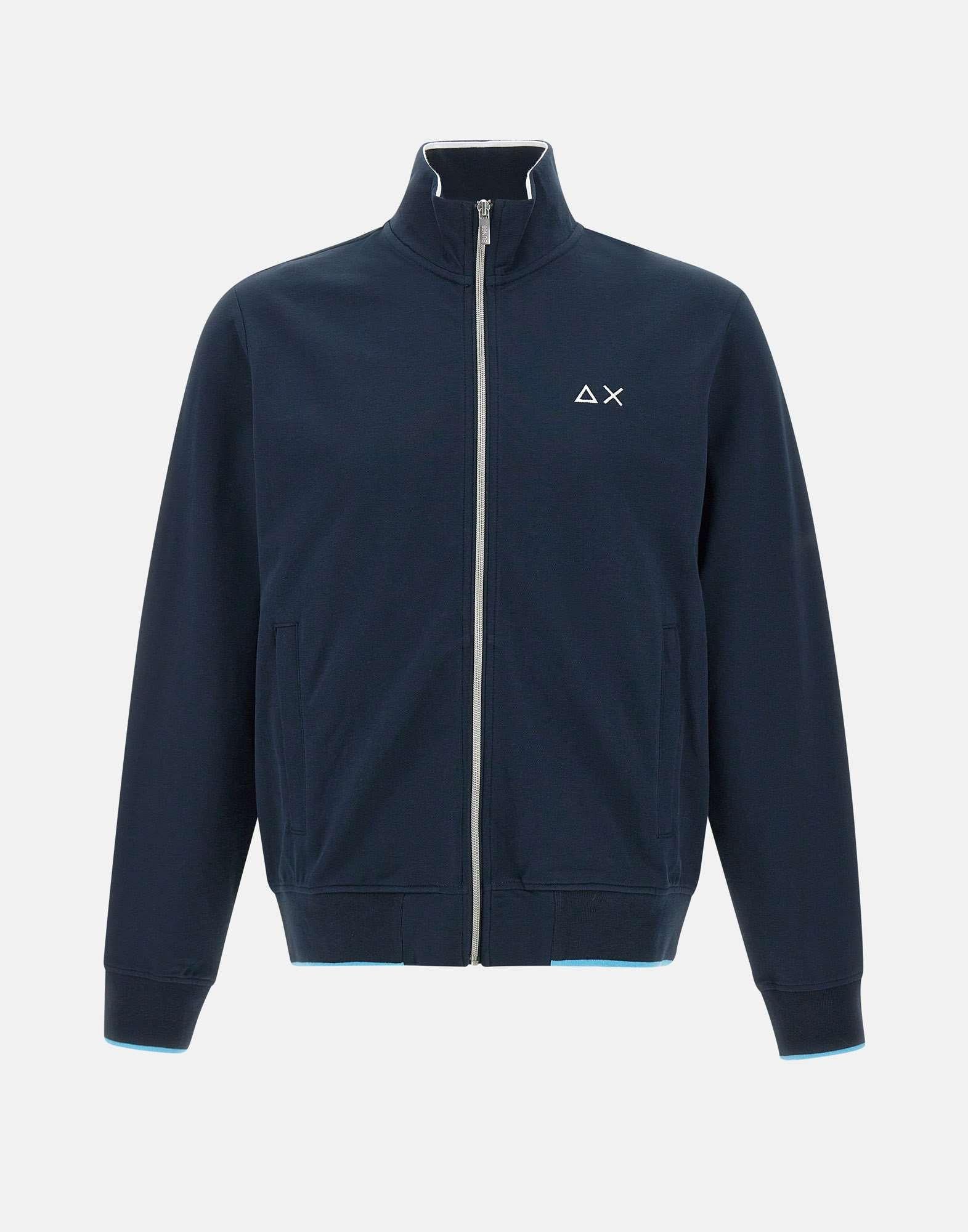 “Track zip piquet polo stripes” uomo Sun68, blu, maniche lunghe, colletto in piedi, profili a contrasto di colore, bordi a coste, tasche laterali con zip, chiusura full zip, interno non felpato, logioa ricamo sul petto, regular fit