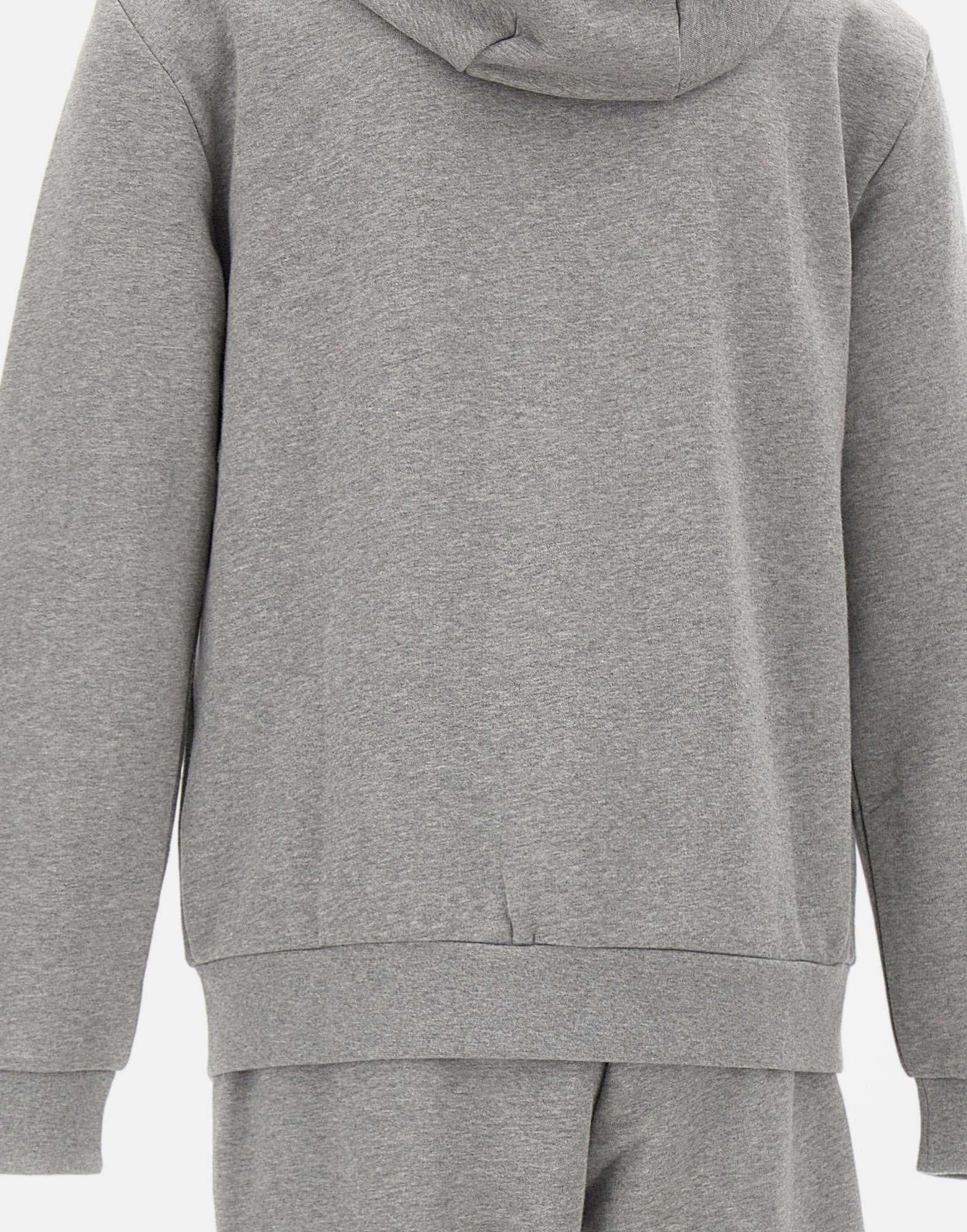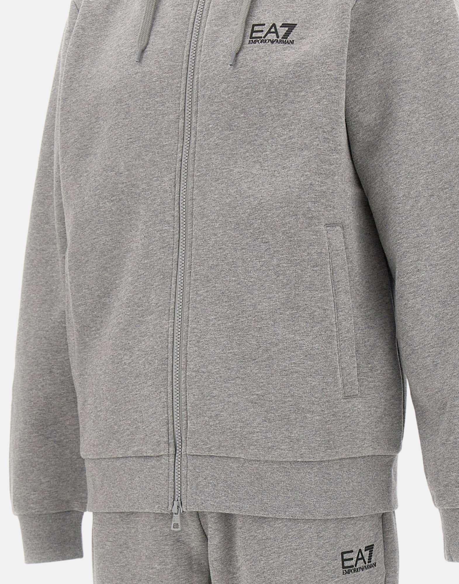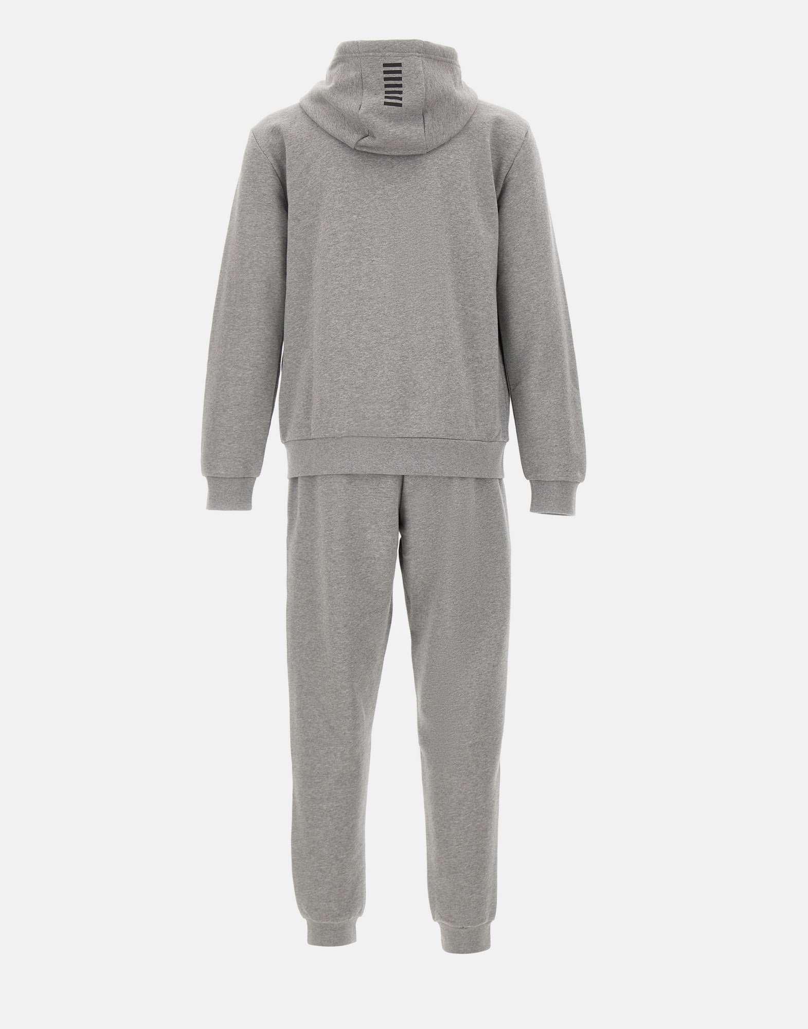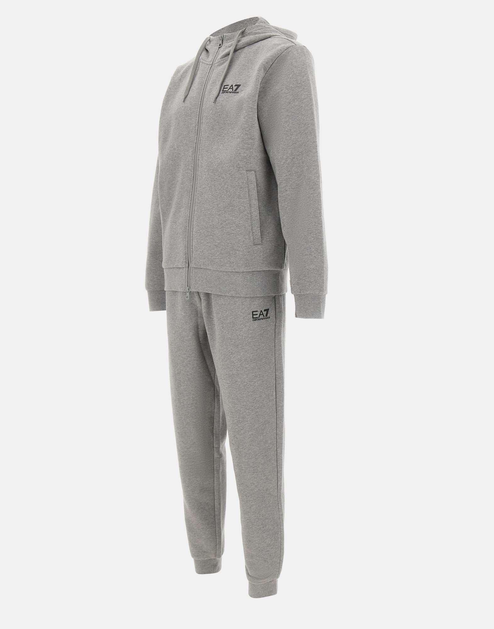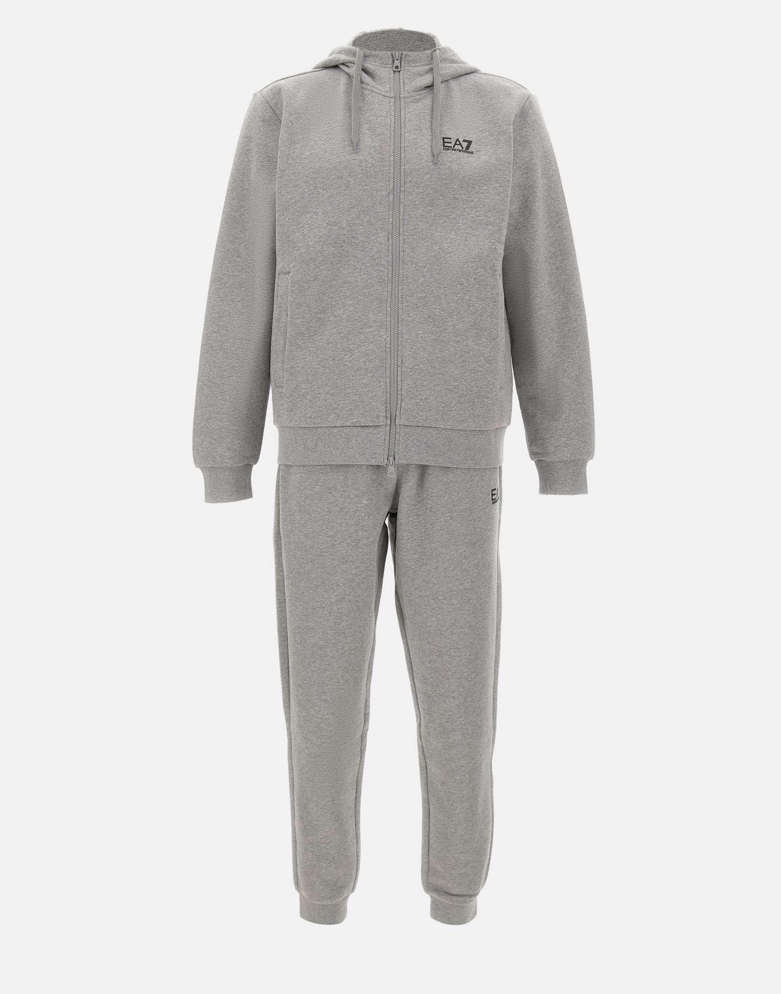 Tuta uomo EA7 “Core Identity” realizzata in misto cotone felpato color grigio mélange, pensata per unire comfort e stile dinamico. Il completo è composto da felpa con cappuccio dotato di coulisse, tasche laterali e chiusura con zip a doppio cursore, abbinata a pantaloni jogger con coulisse in vita, tasche laterali e fondo caviglia elasticizzato. Il logo EA7 stampato a contrasto sul petto della felpa e sulla gamba sinistra dei pantaloni firma il design con un dettaglio riconoscibile. Regular fit, ideale per lo sport e i momenti di relax.
