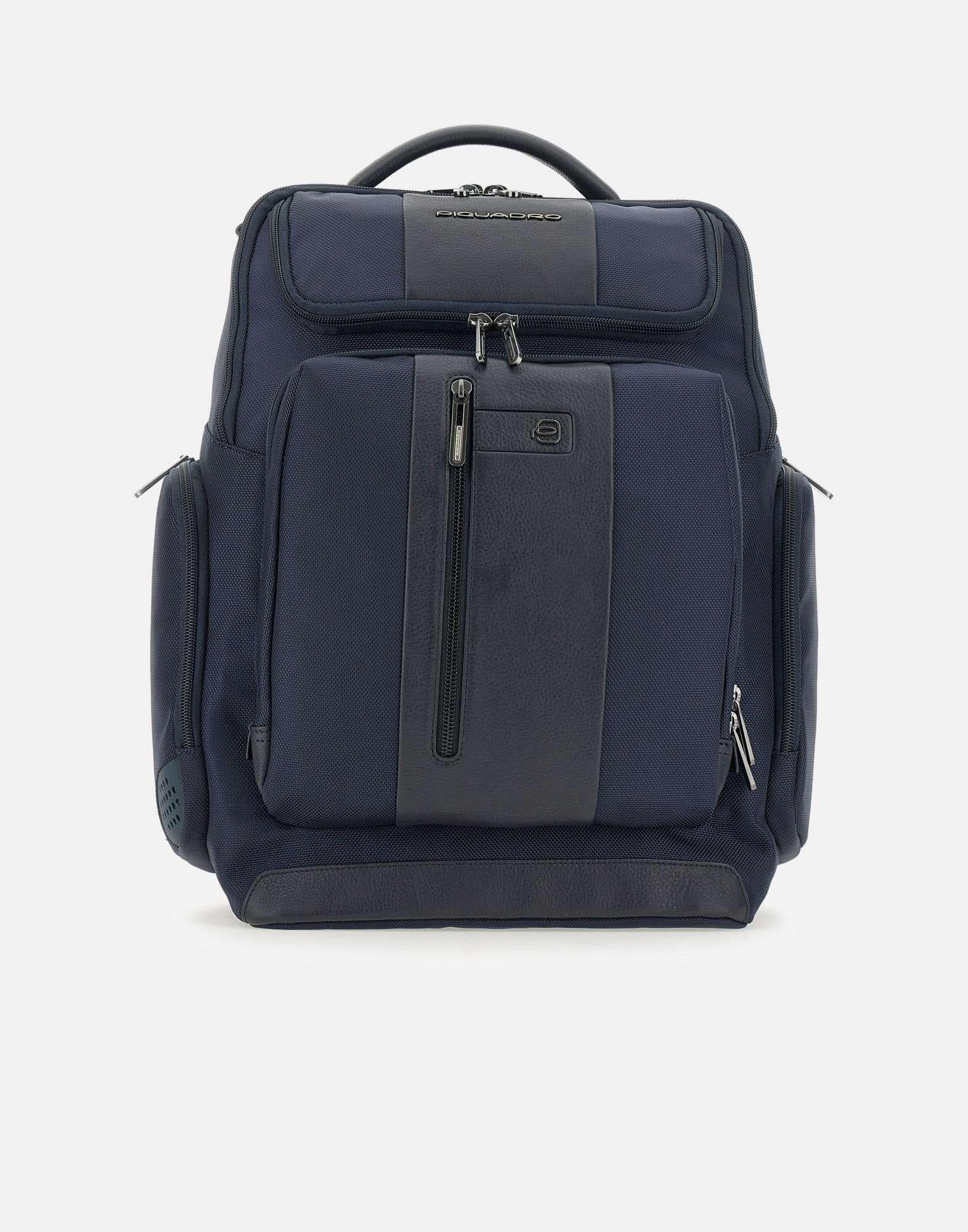 Zaino Piquadro, colore blu, porta pc 15,6″ in tessuto riciclato e pelle, protezioni antiurto e anti RFID e tasca per AirPods®, due scomparti, Shock Absorber, Porta Ipad Pro ® 12,9 fisso, manici fissi, porta badge, fodera in poliestere, multitasche, portaocchiali, litraggio 29, dimensioni: 34cm lunghezza, 43cm altezza, 19 cm. Peso: 1436 gr